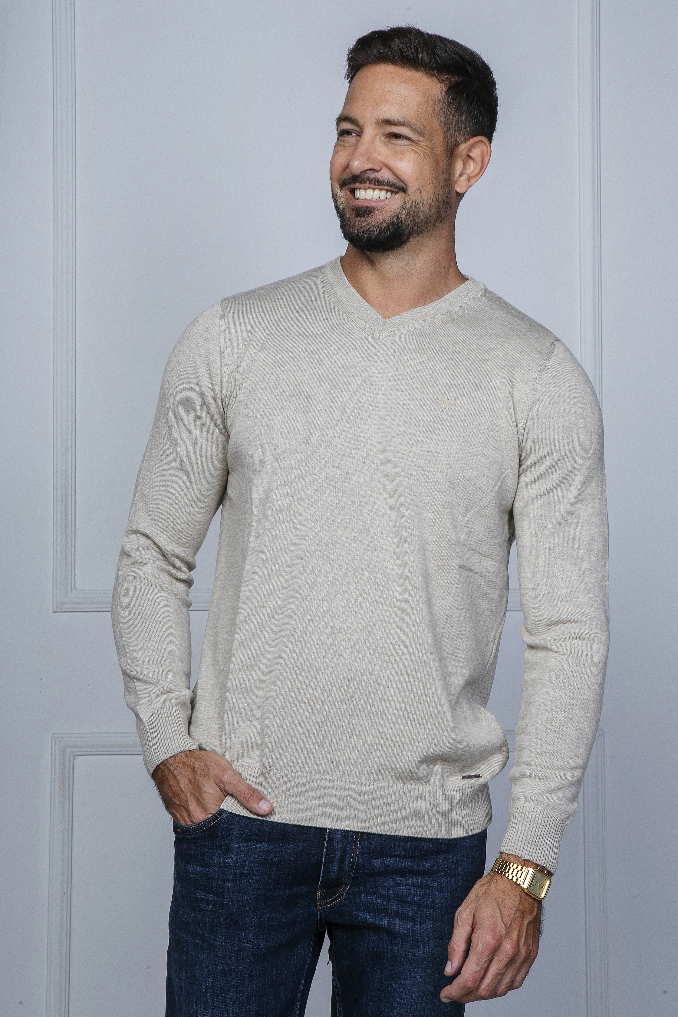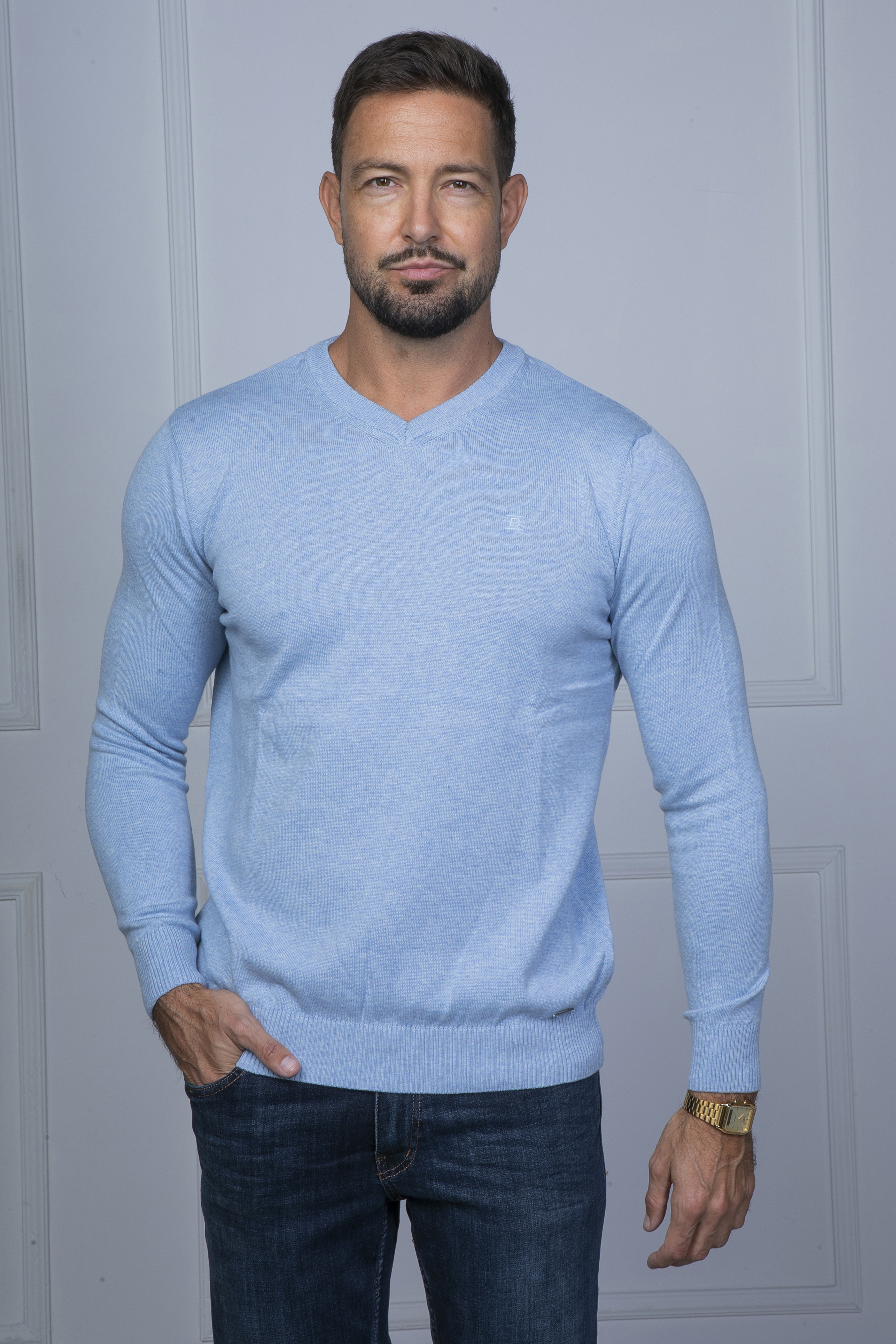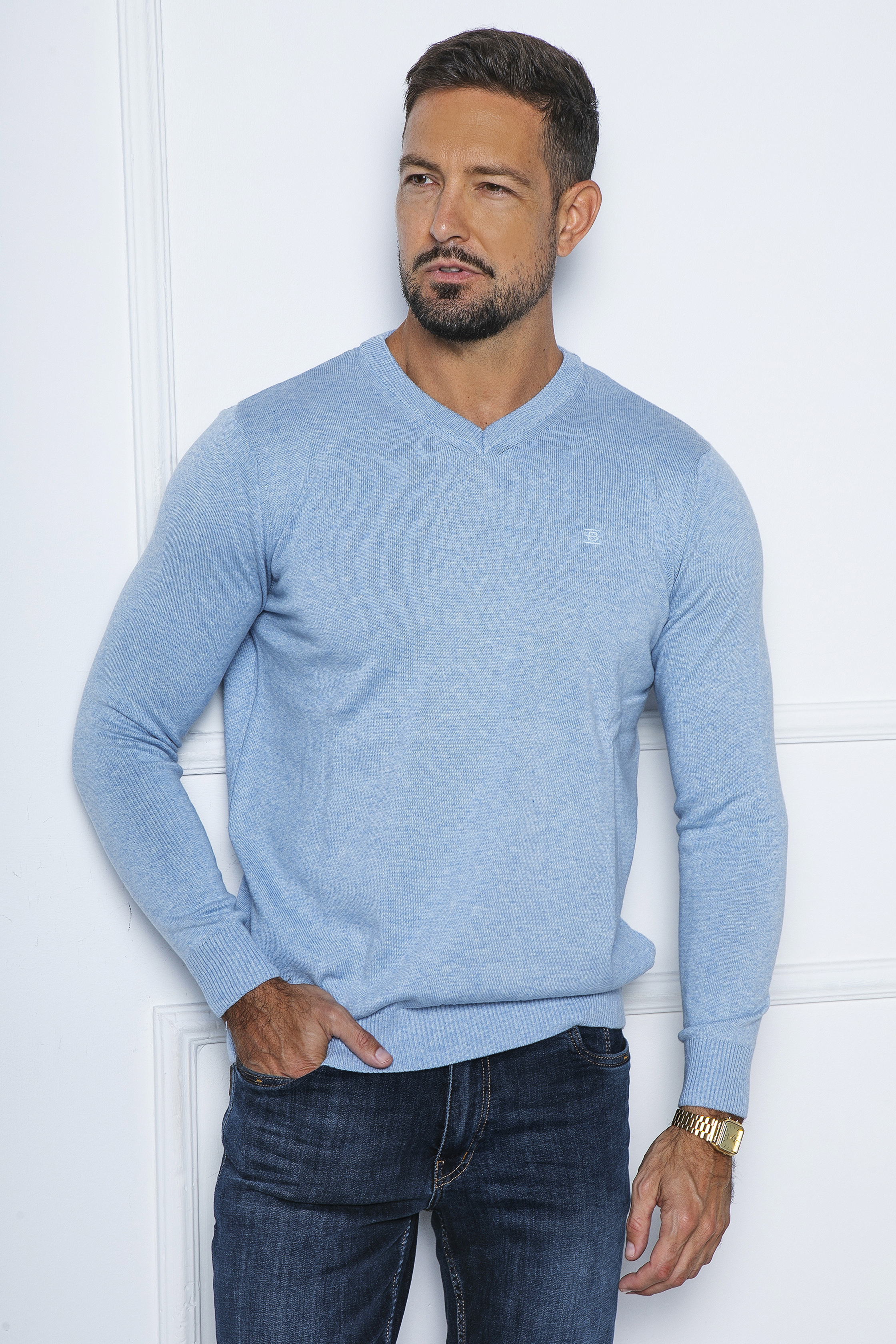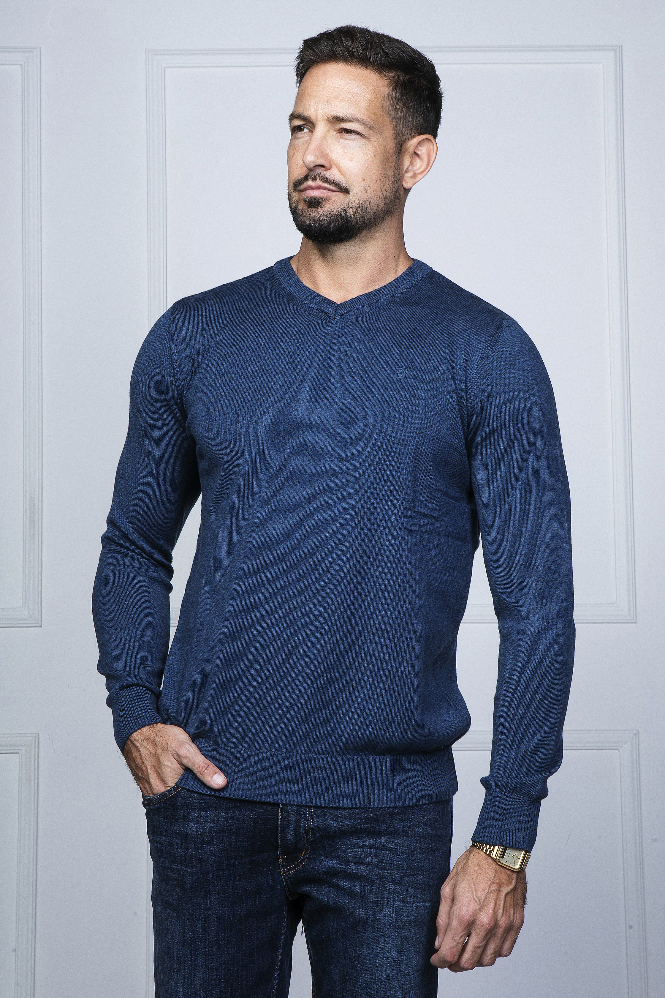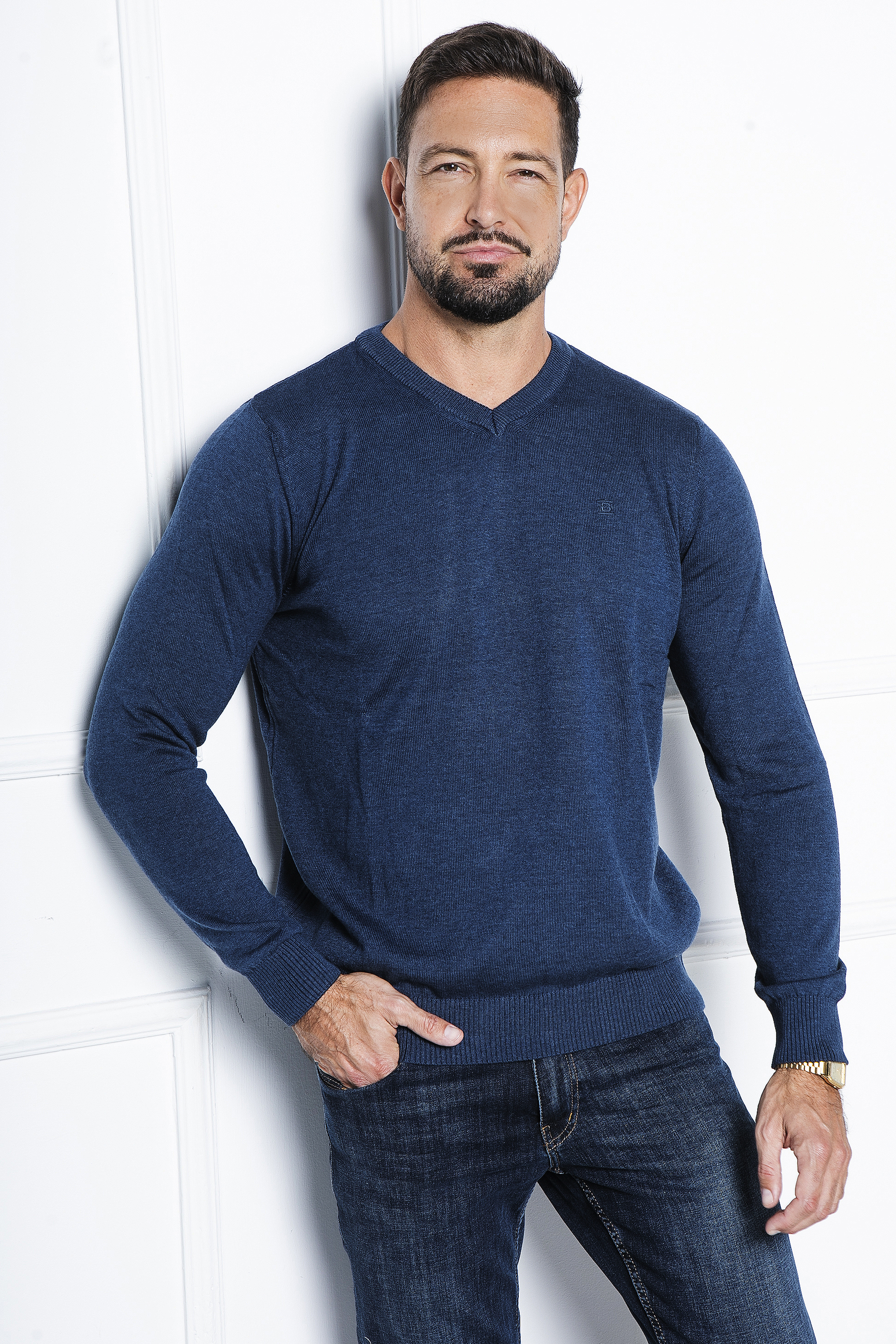 Melange kötött pulóver V nyakkal. Szolid hímzéssel a mellén és fém logó díszítéssel a passzé fölött. Remek viselet inggel kombinálva vagy akár önmagában hordva.