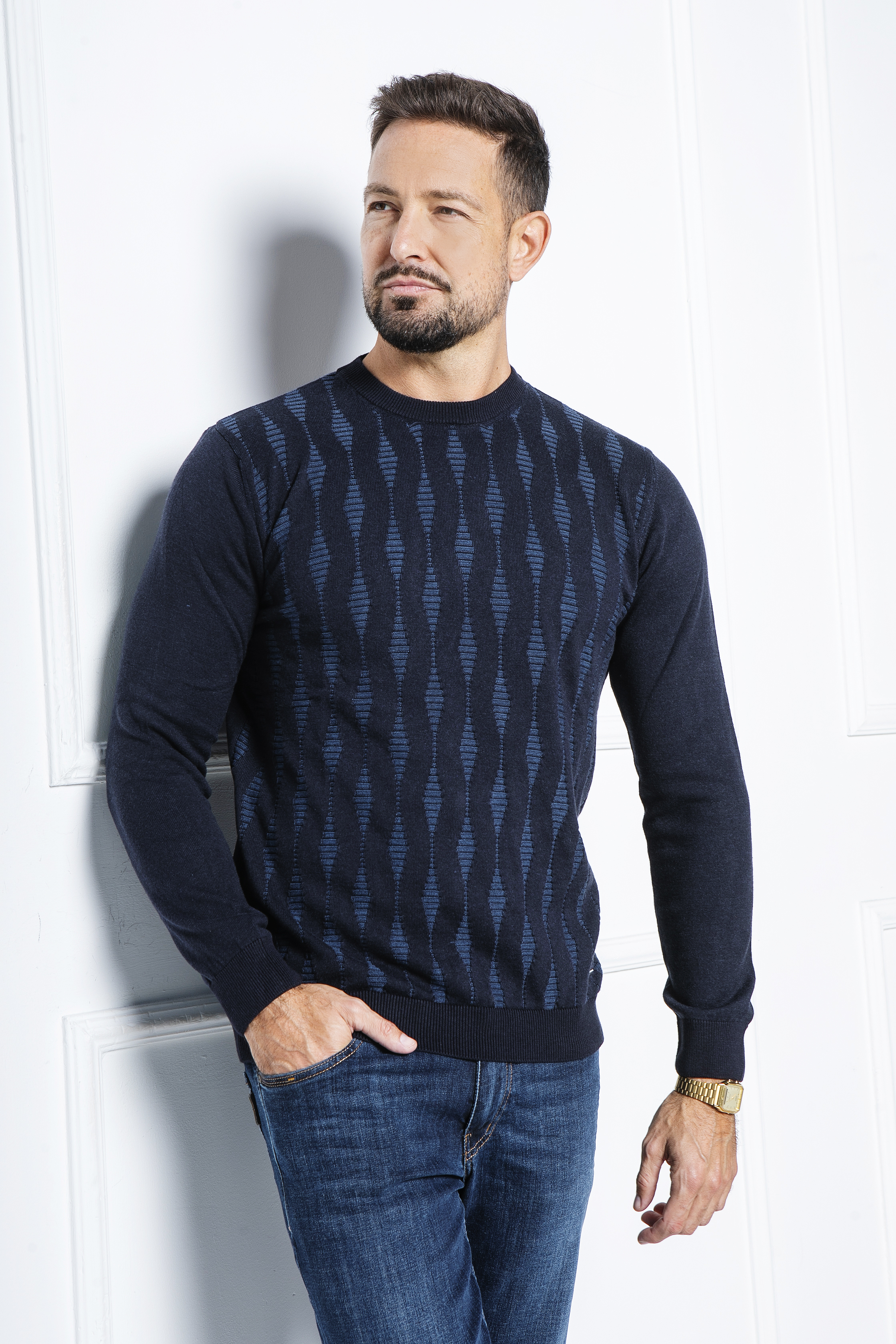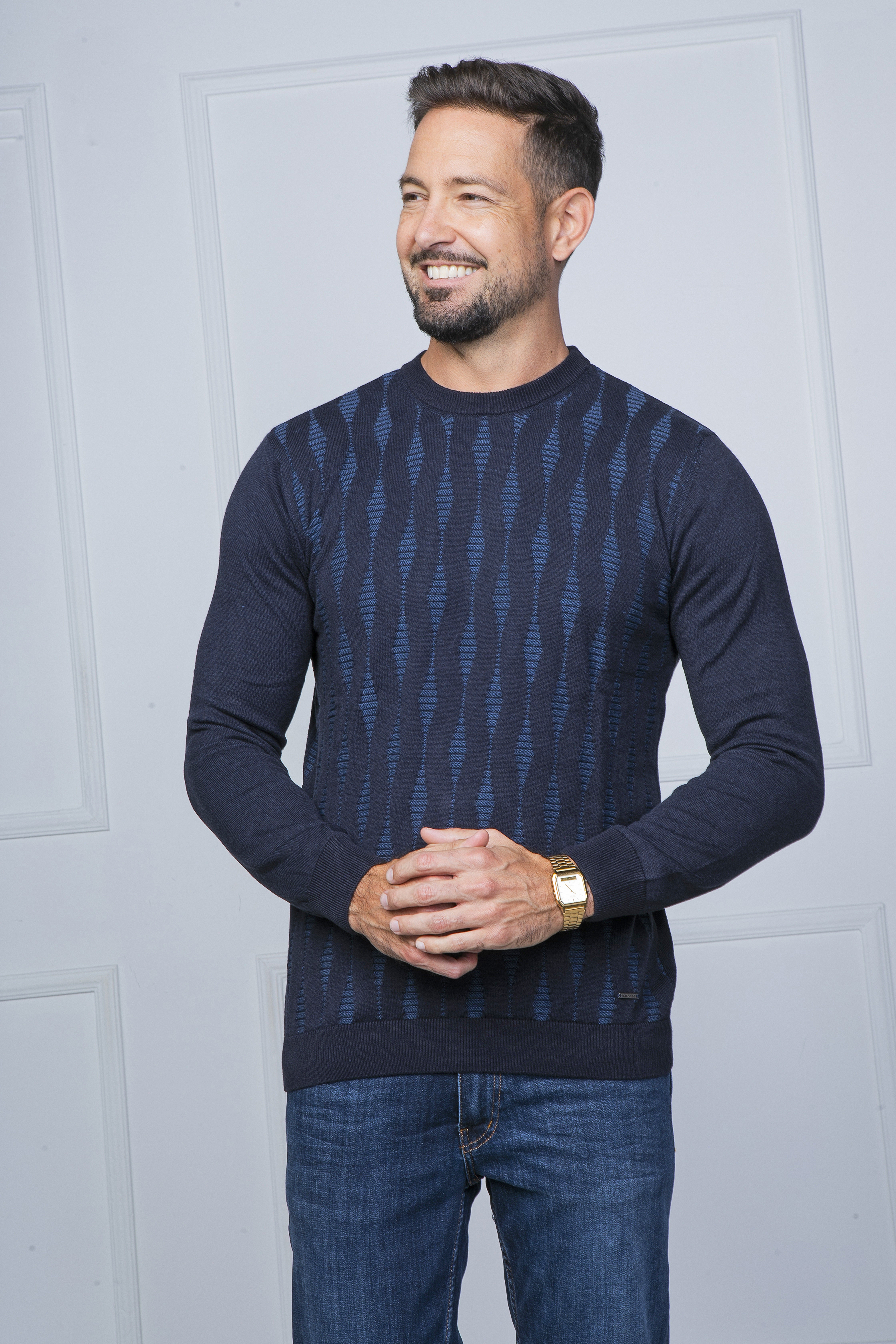 Csavart mintás kötött pulóver kerek nyakkal. Szolid fém logó található a passzé felett. 100% pamut. Slim fit