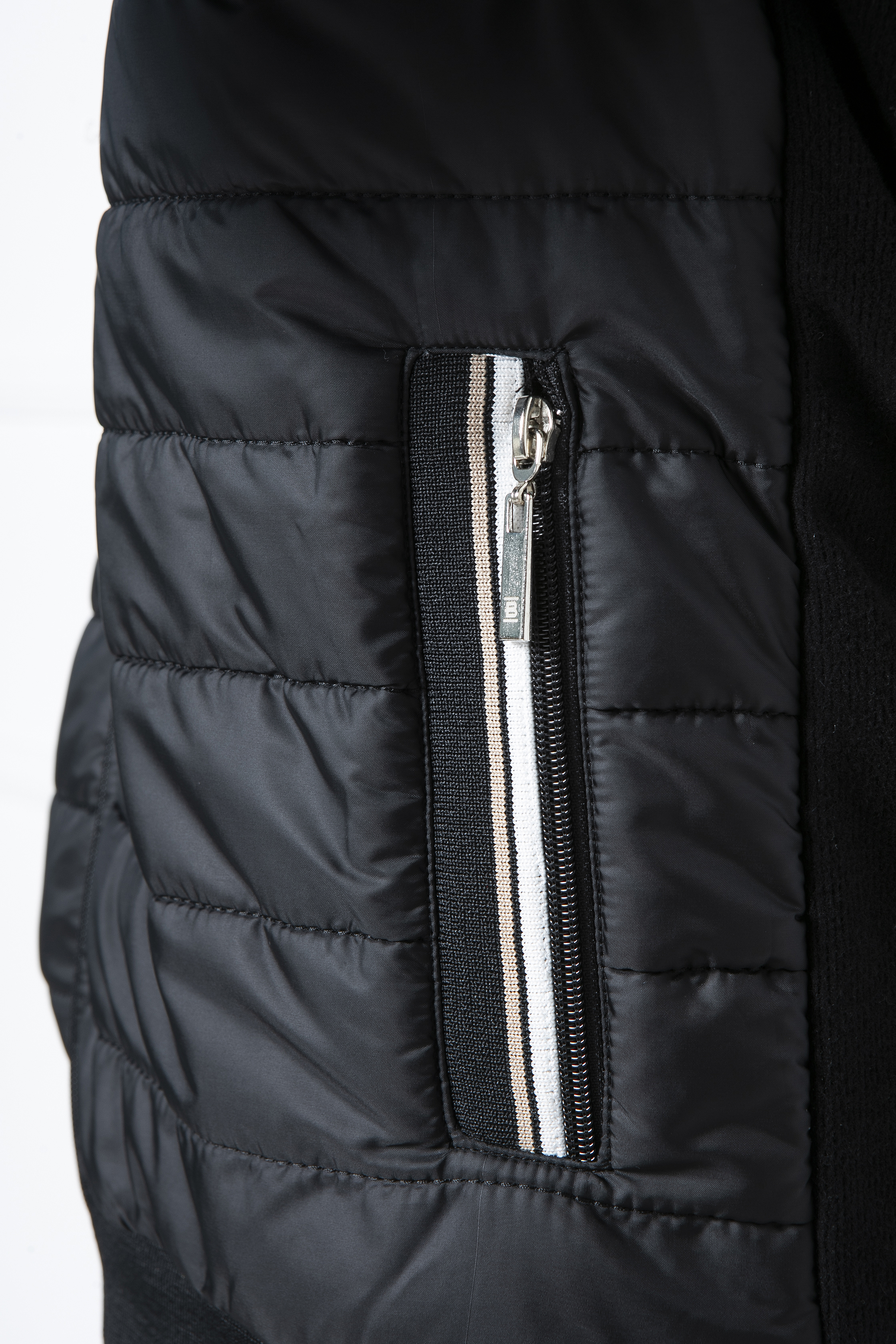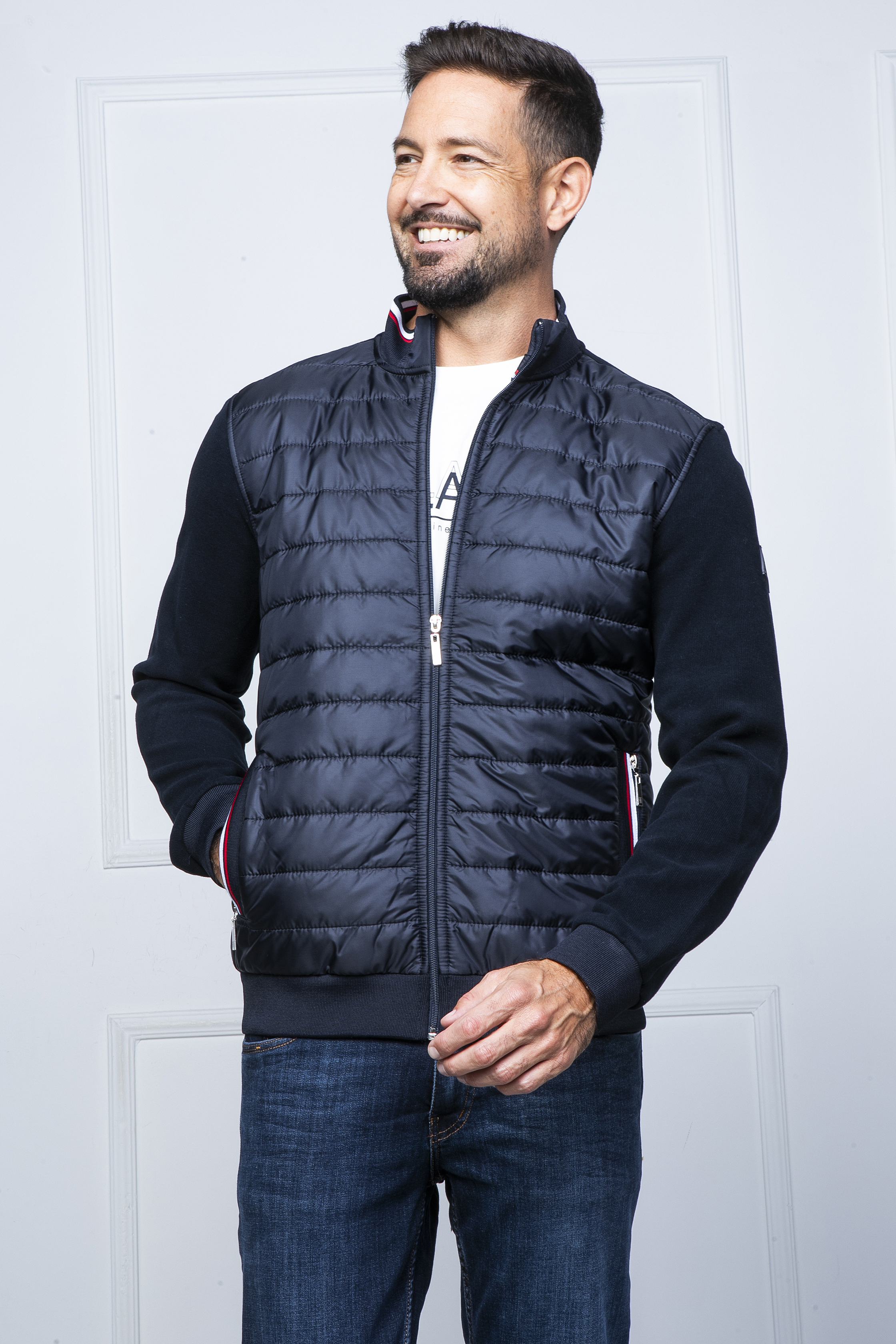 Steppelt elejű kardigán. Háta és az ujja sima pamutból készült. Színes szalag díszítéssel és gumi címkével az ujján. Slim fit