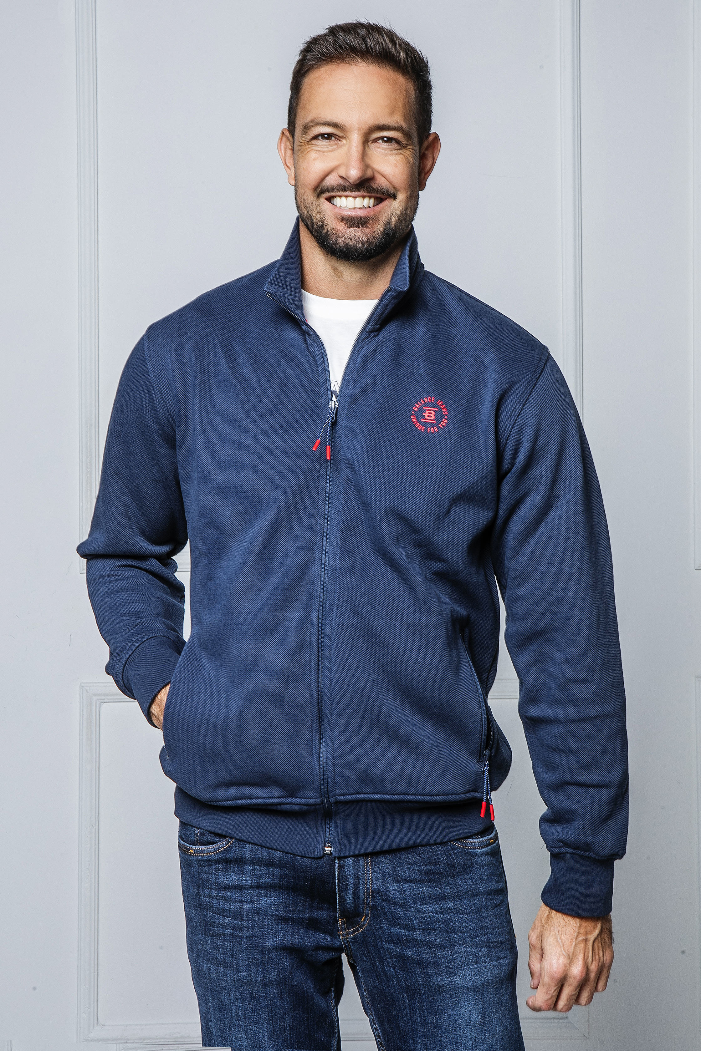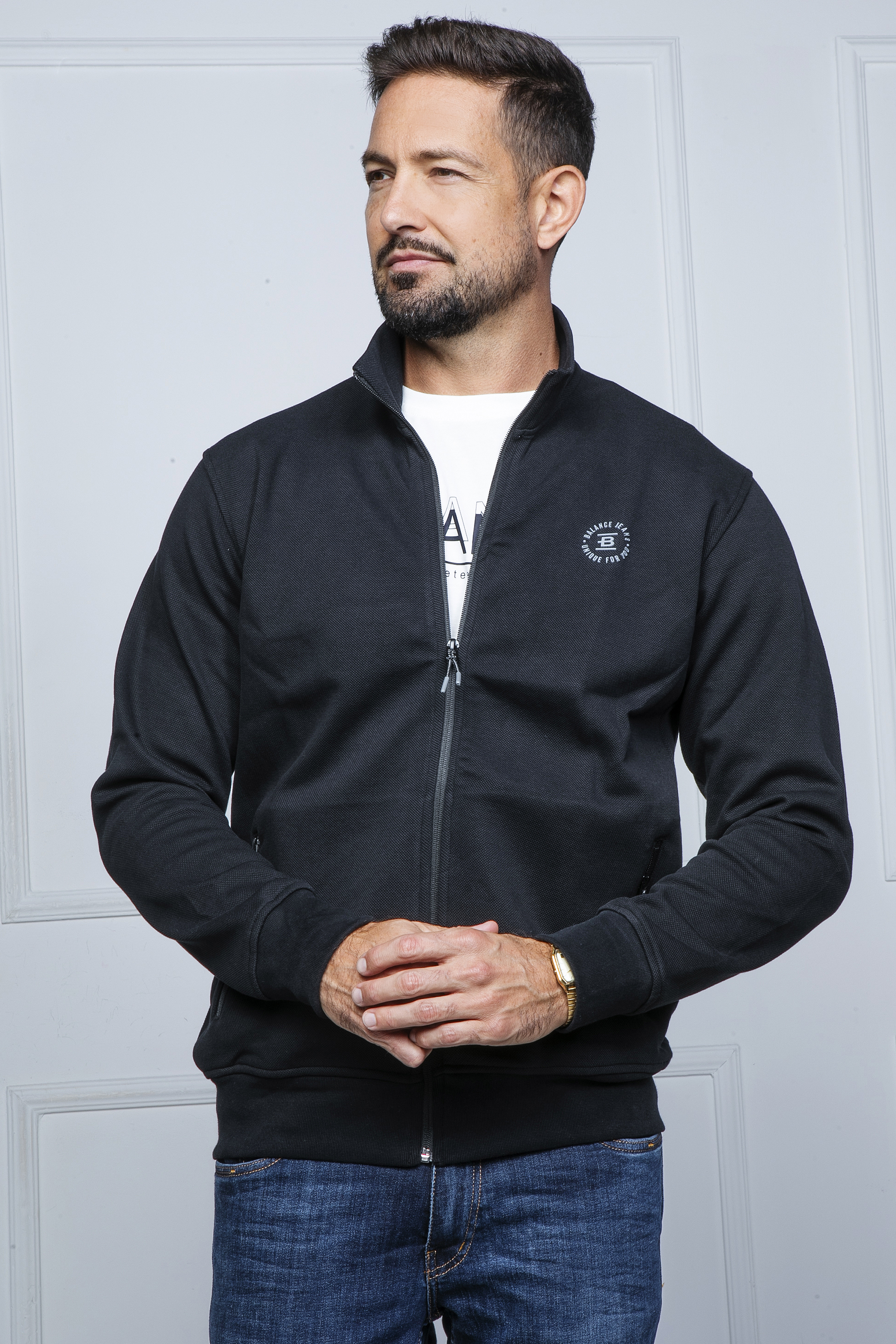 Zipzáras pulóver, vastag piké anyagból. Színes kiegészítőkkel ( a kék pulóveren piros, a feketén szürke) és mell nyomattal.