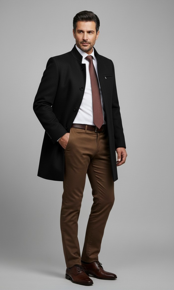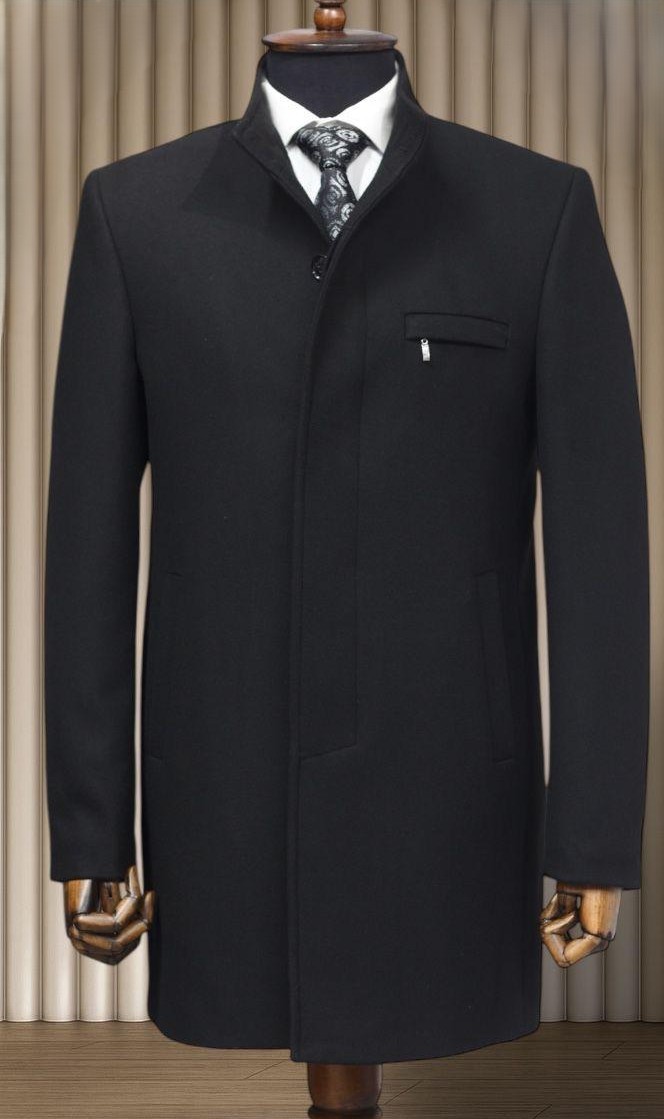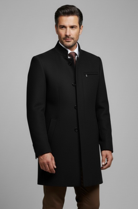 Állógalléros szövetkabát, prémium alapanyagból. Elegáns kabát, cipzáros szivarzsebbel a mellén és rejtett gombolással.