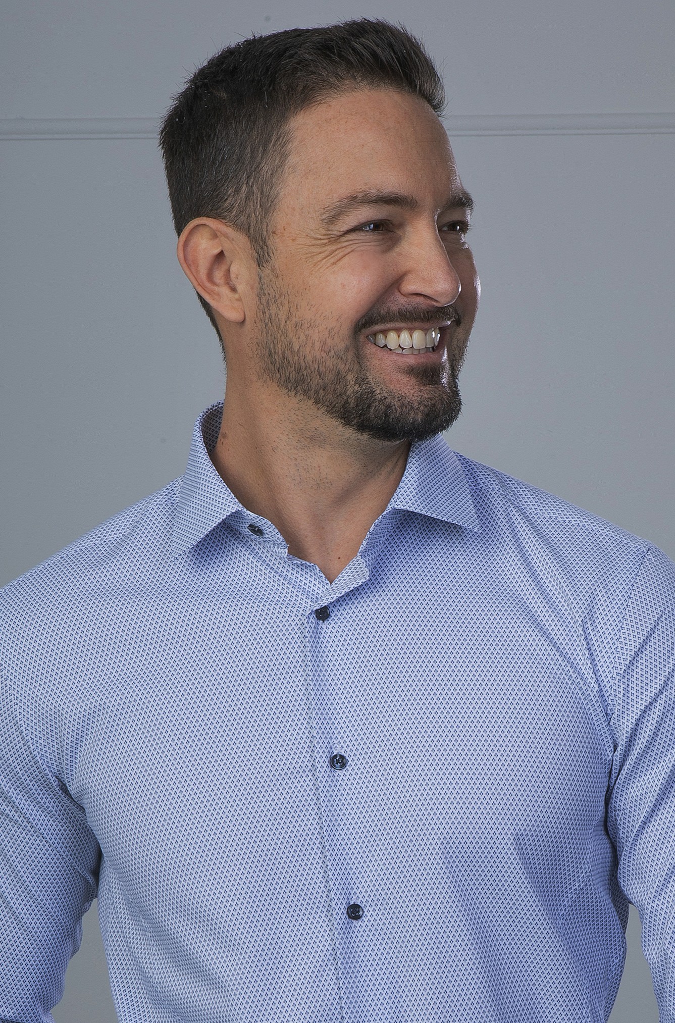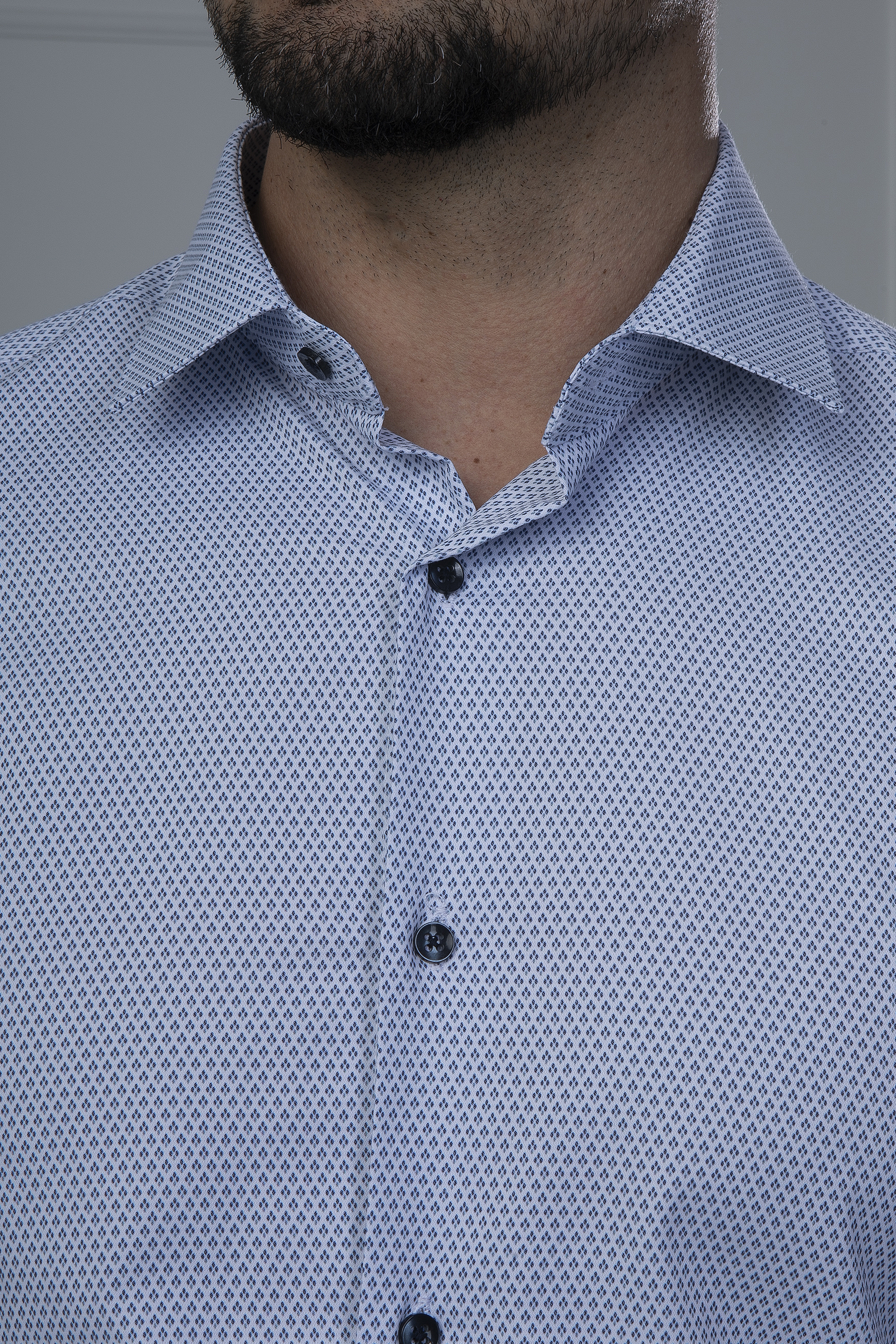 Nyomott, apró-mintás ing, enyhén karcsúsított szabással. Hosszított fazon (testhossz +5cm, ujjhossz +3cm) Rugalmas alapanyag, kényelmes viselet. Vasalás könnyített anyagból, pamut alapanyagból készült. Hordható magában is, de akár zakókkal is jól kombinálható. 93% pamut  3% lycra