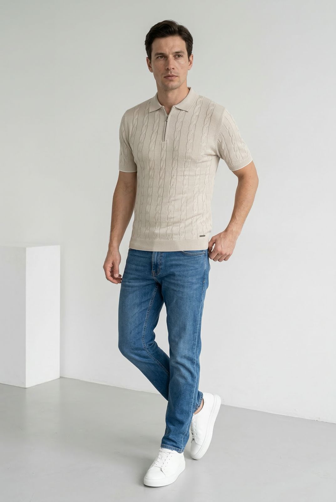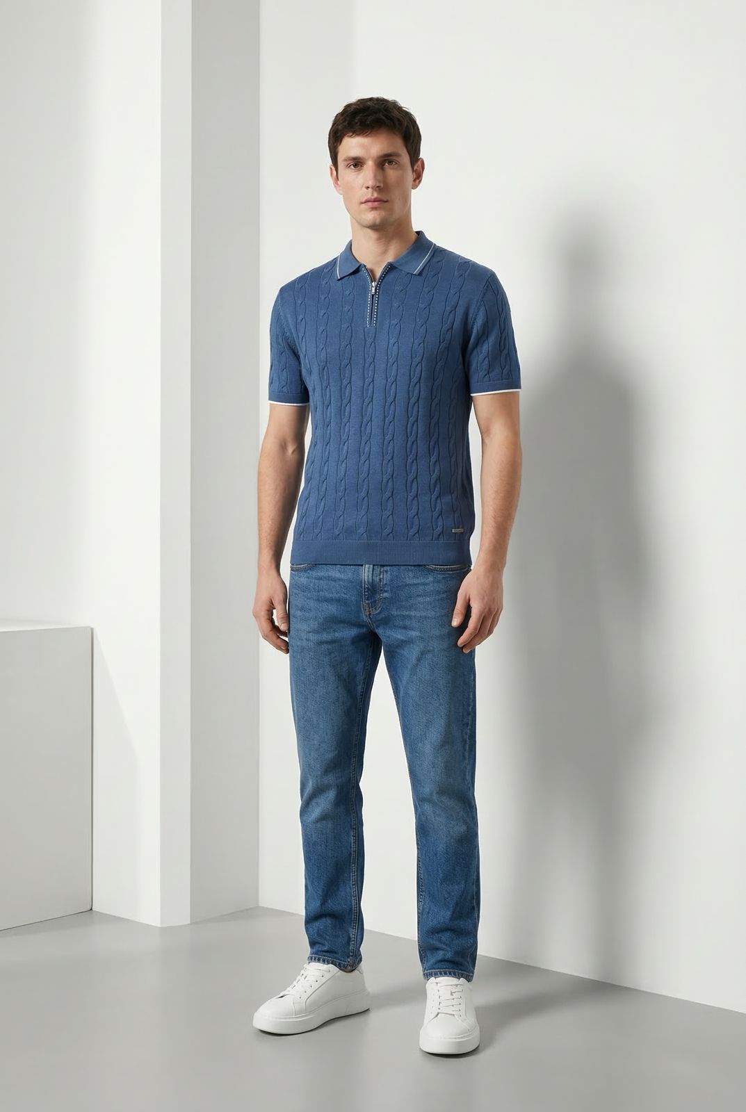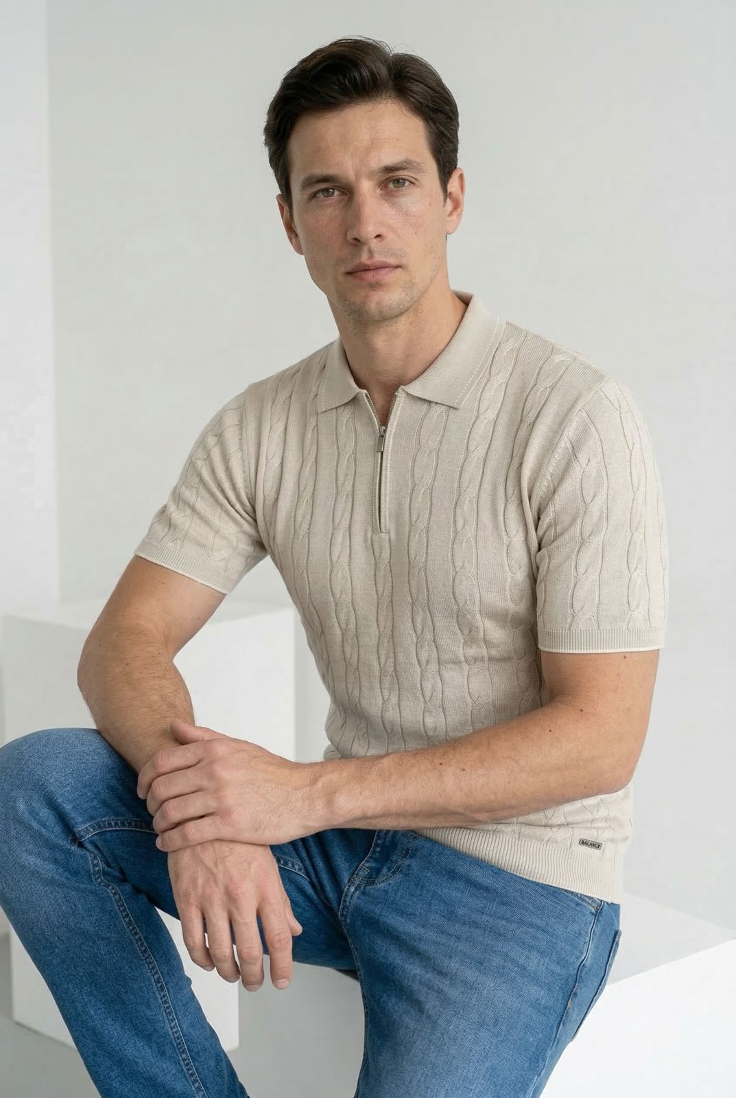 Csavart mintás vékony kötött póló gallérral és zipzárral. A galléron és a zipzár mellett halvány csíkminta van. Szolid fémlogó  található elöl az alsó  passzé felett. Könnyű szellős anyaga miatt remekül hordható az átmeneti időszakokban, de akár a nyári estéken is. Elegáns viselet, akár zakóval is kombinálható. 50% viszkóz 50% acryl