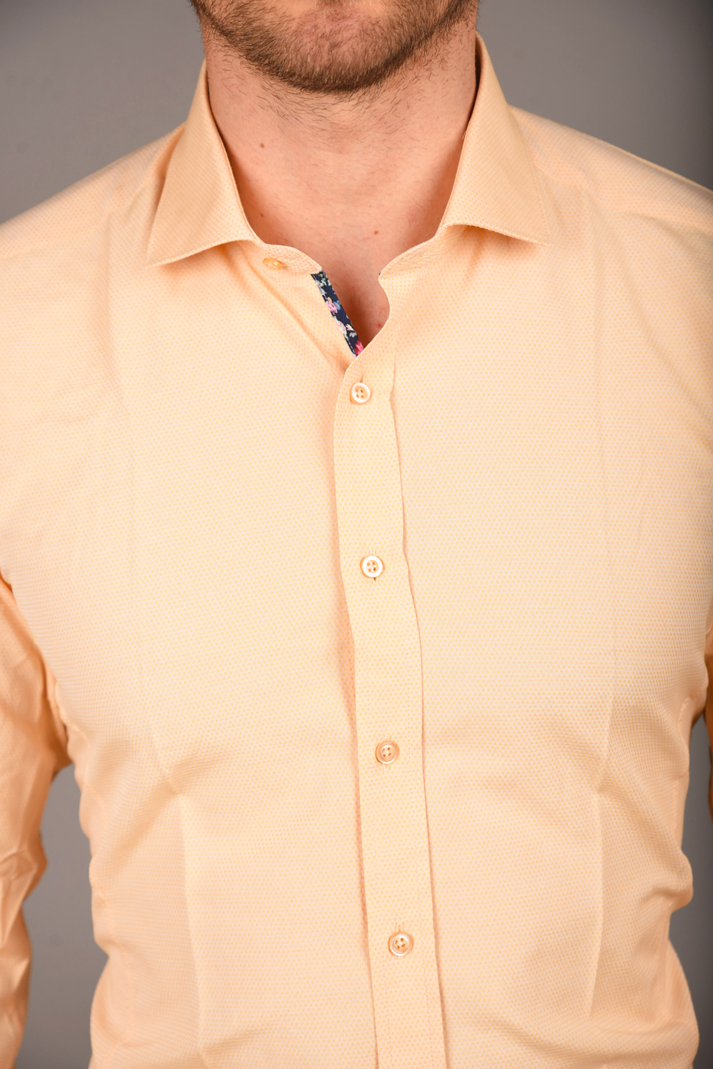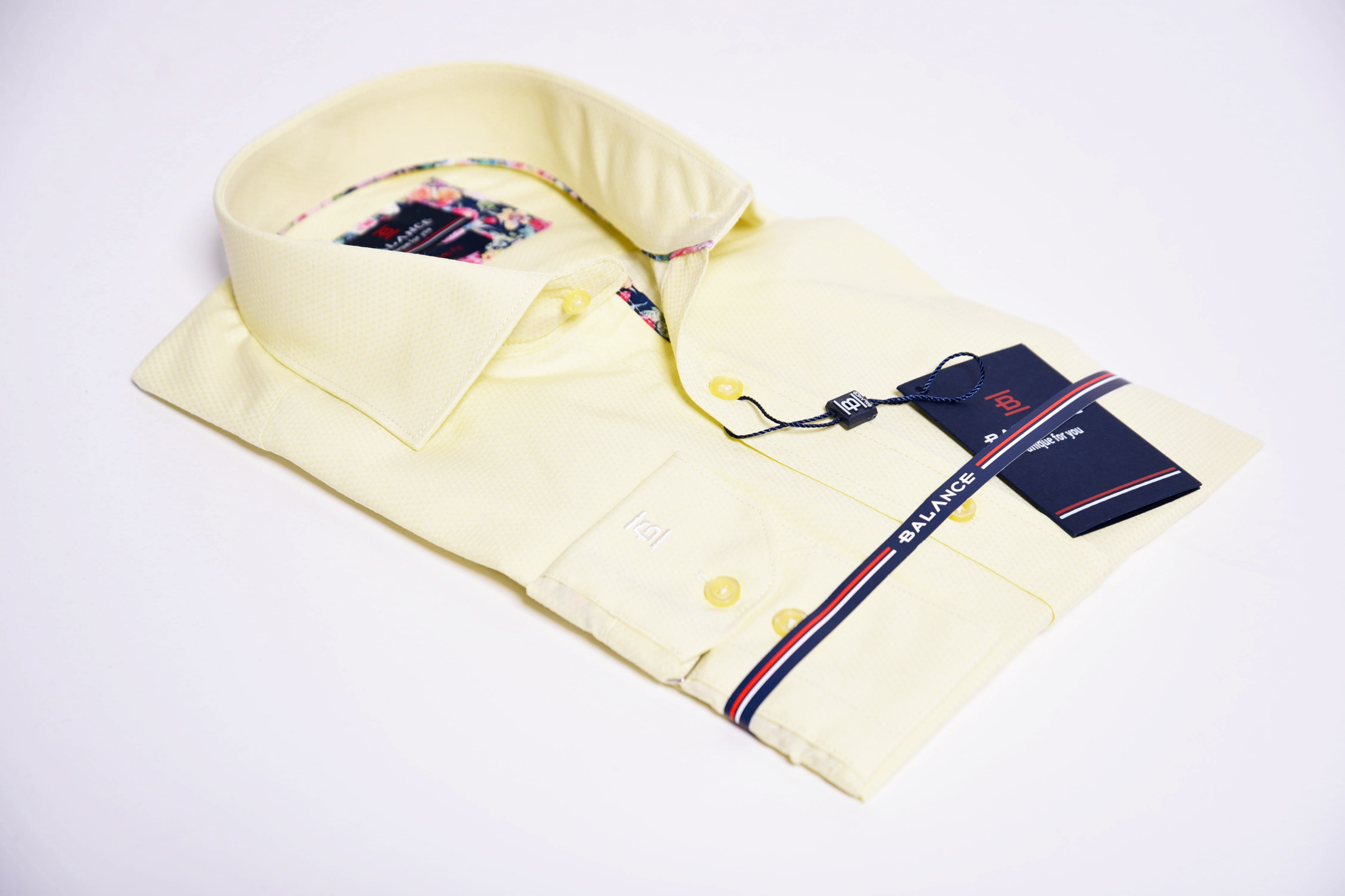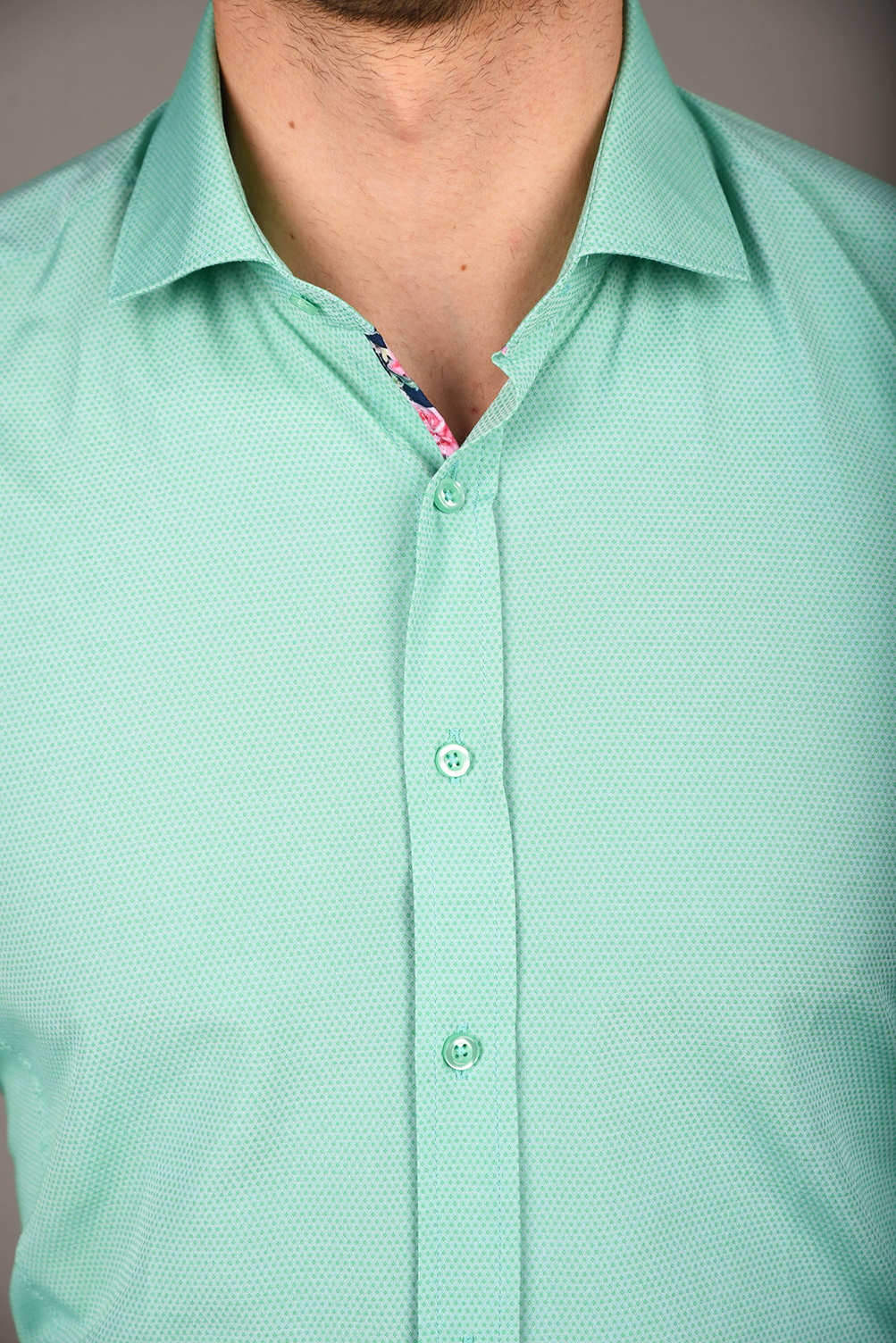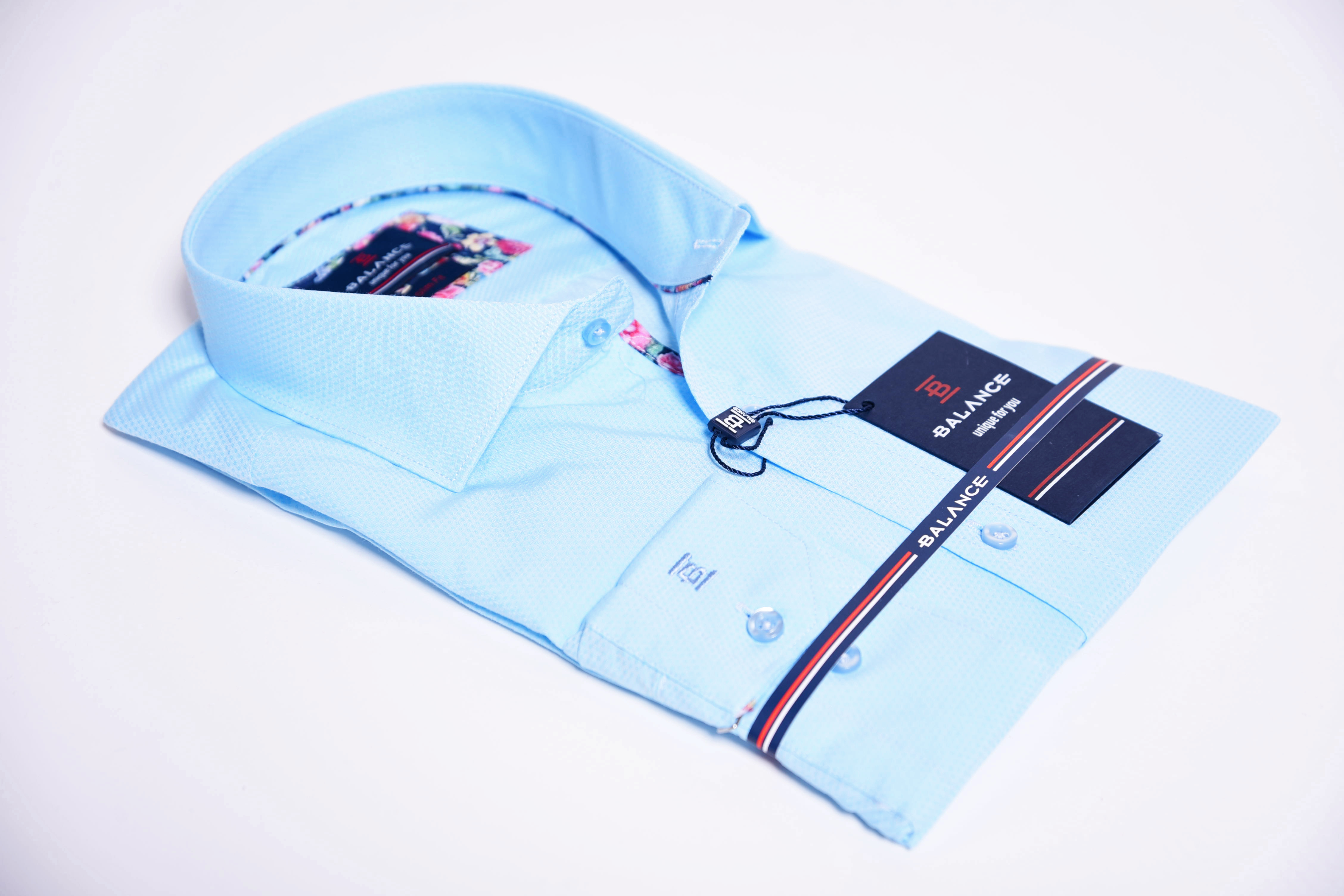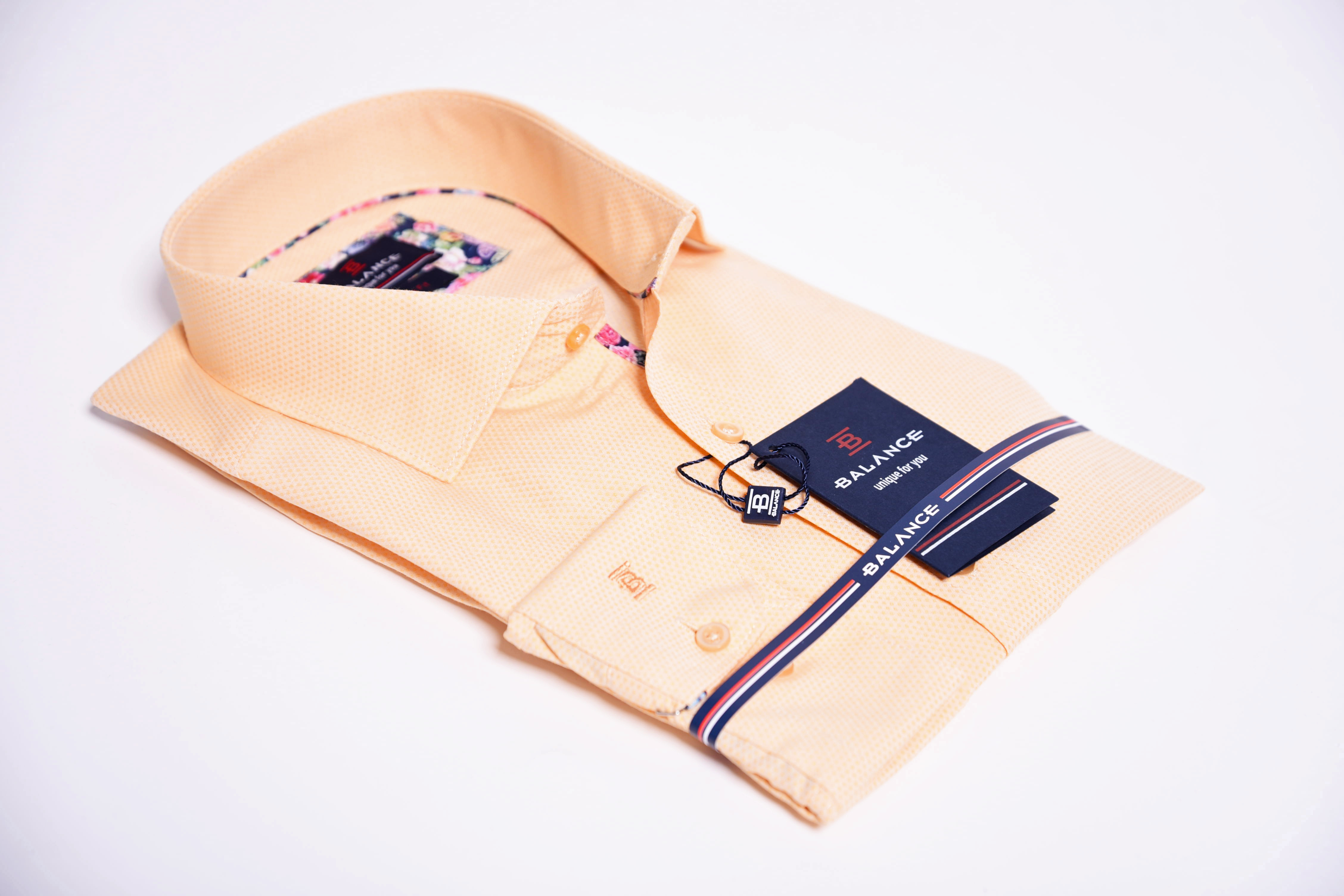 Egyszínű ing struktúrált anyagból. Virágmintás betéttel a gombolópántnál és belül a címke alatt. Igazi tavaszi-nyári darab, gyönyörű pasztell színekkel. 80% pamut 20% PE. Slim fit