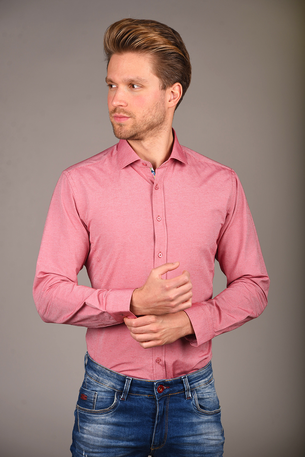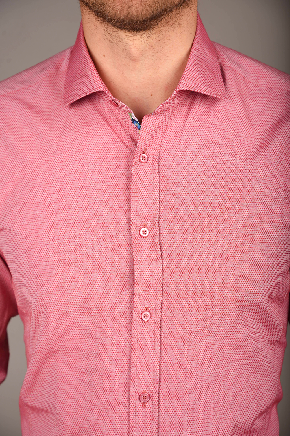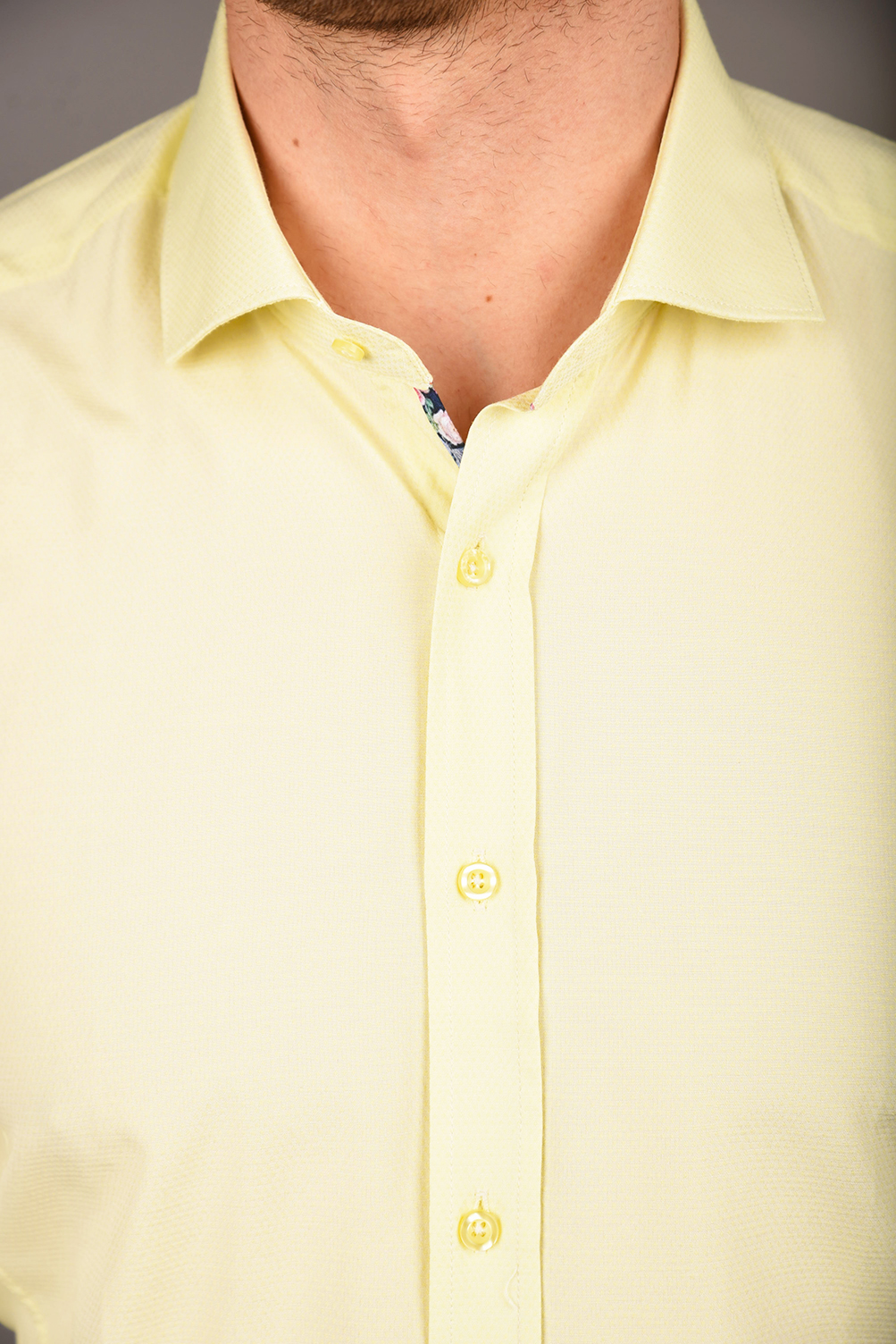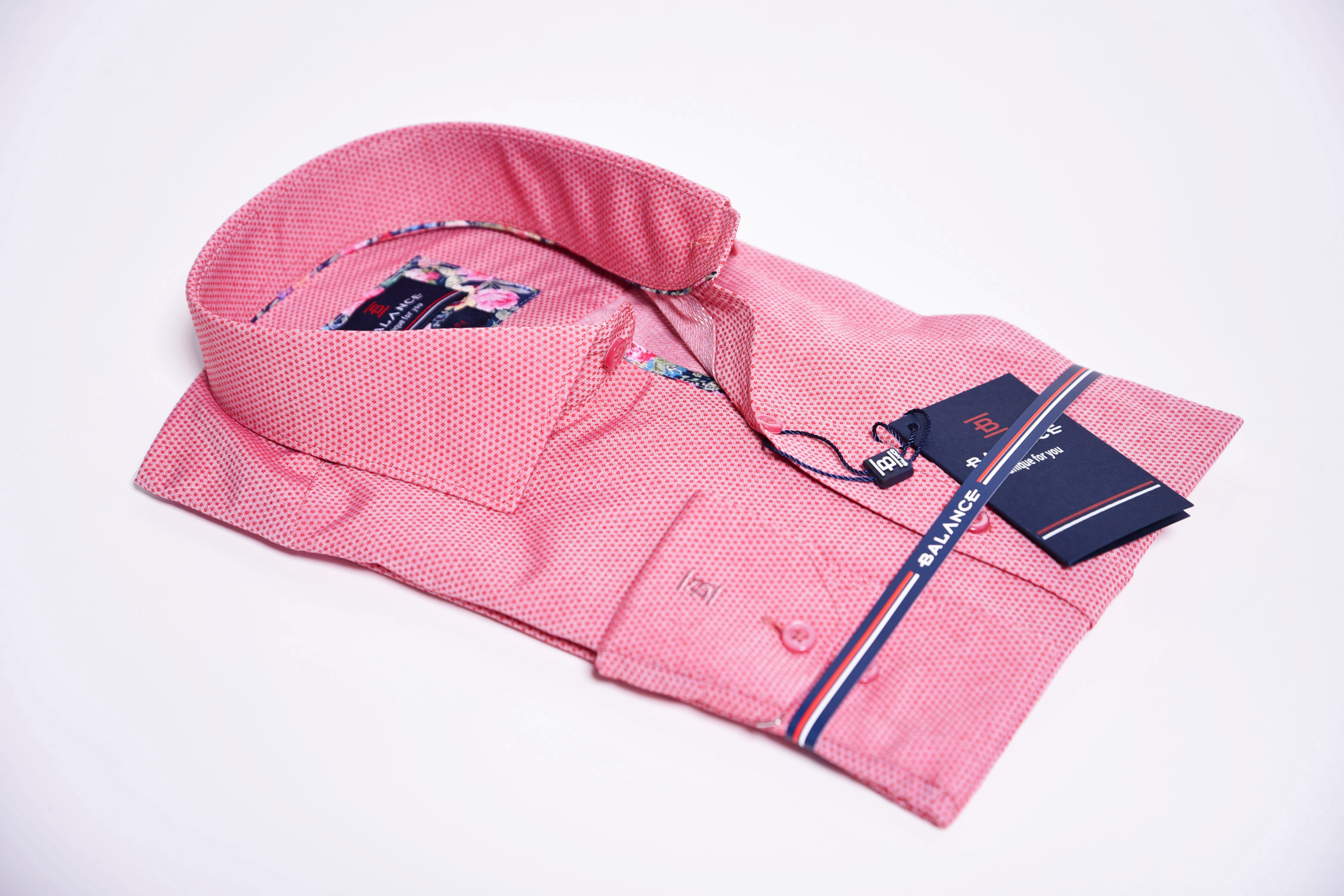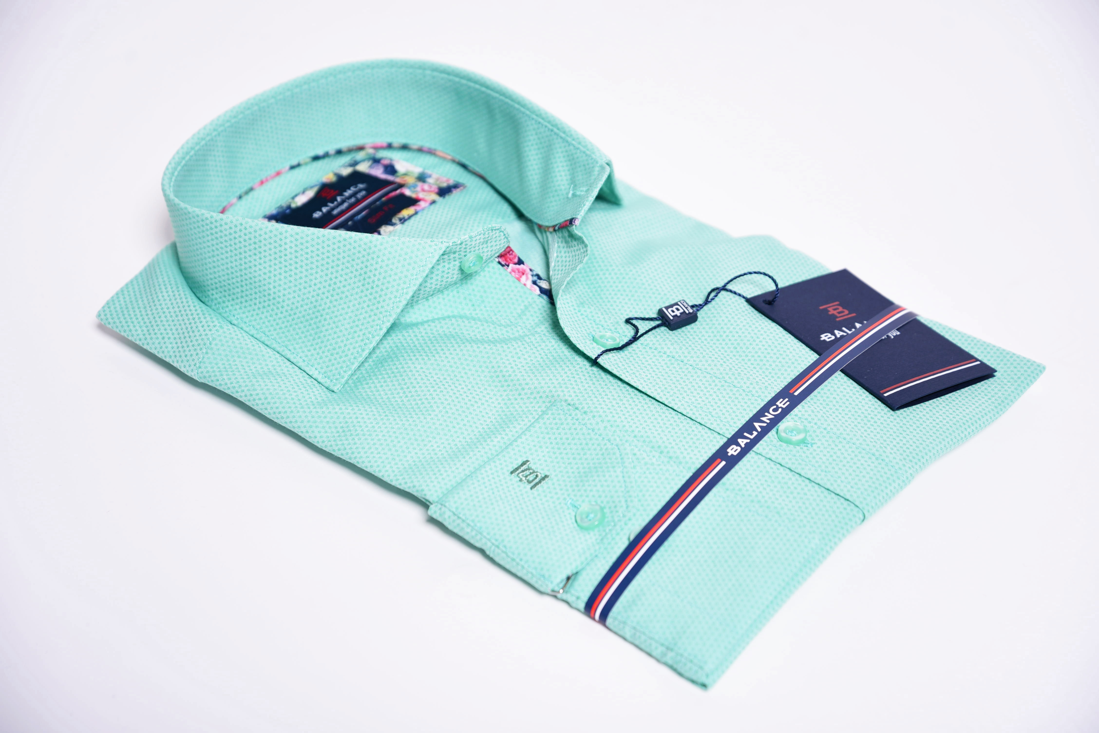 Egyszínű ing struktúrált anyagból. Virágmintás betéttel a gombolópántnál és belül a címke alatt. Igazi tavaszi-nyári darab, gyönyörű pasztell színekkel. 80% pamut 20% PE. Slim fit