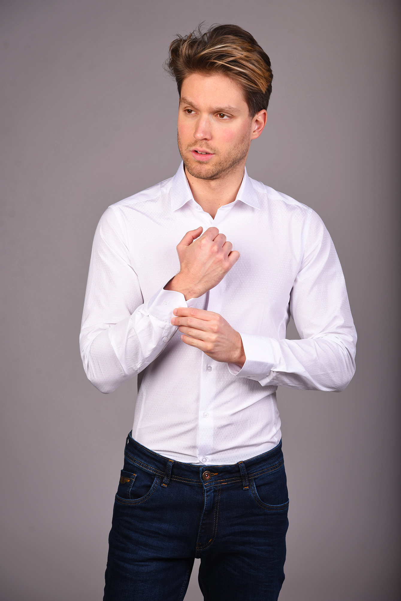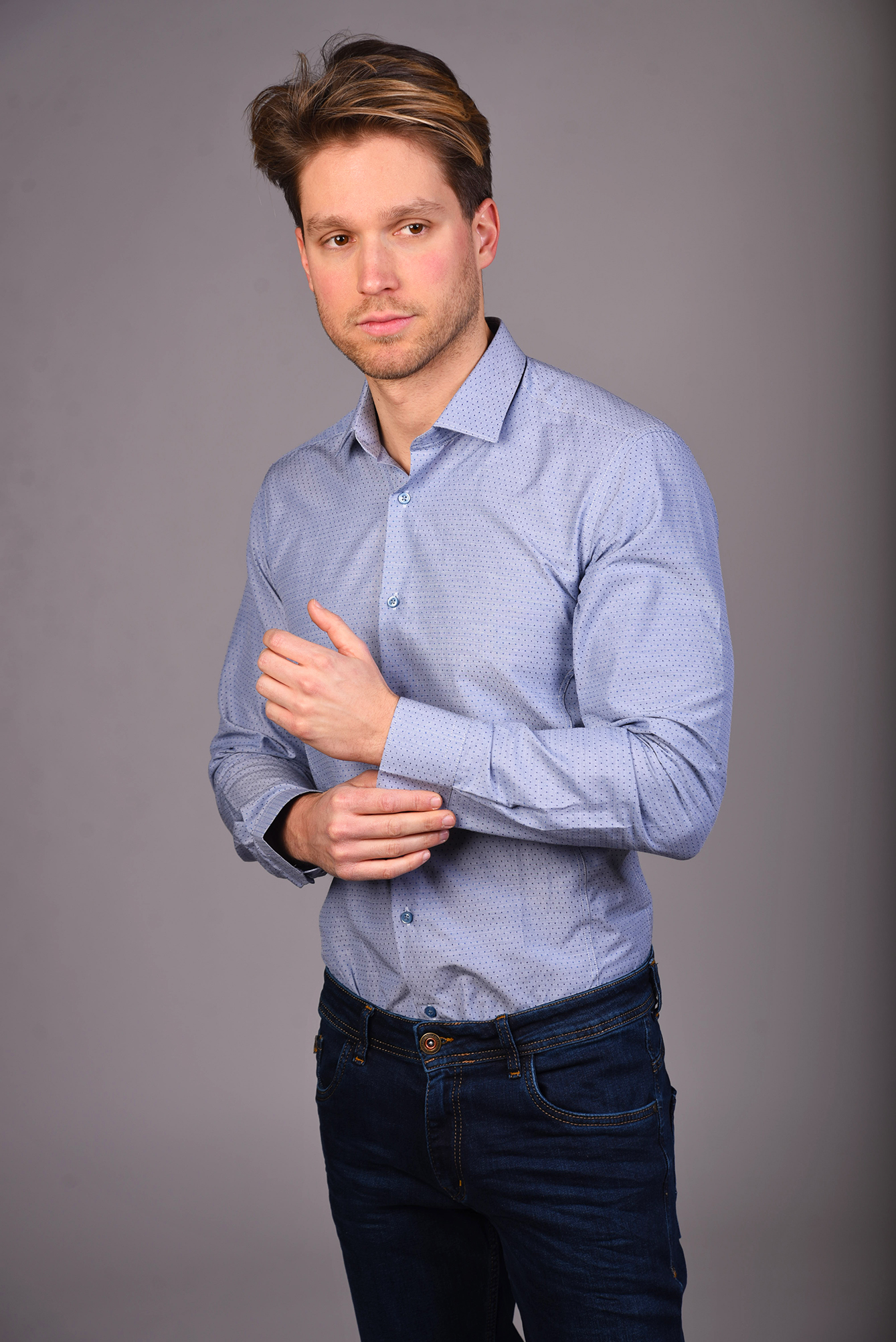 Szövött mintás anyagú ing. Apró pöttyös.szövött mintával.Enyhén karcsúsított fazon. Hosszított fazon, +5cm a testhosszra és +3cm az újjhosszra. Magas embereknek remek választás. Mandzsettán szolíd B logó hímzés található. Casual stílus. Farmer és chino nadrágokkal jól hordható, de akár zakó alá is jó választás. 80% pamut, 20% PE. Long fit