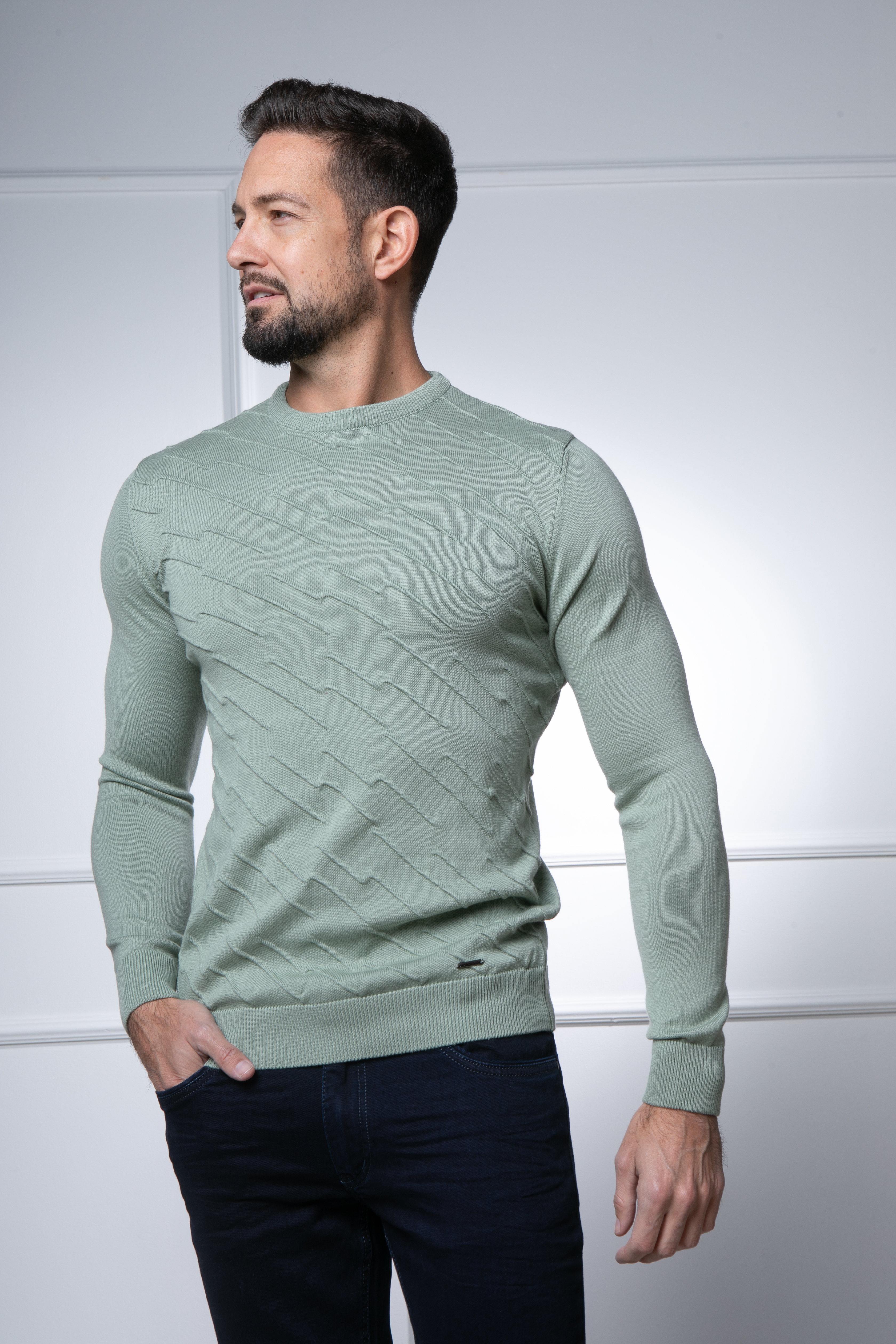 Kötött, környakú pulóver. Elején struktúrált 3D kötésmintával. Az ujja és a háta sima kötéssel készült. A passzé felett szolid Balance fémlogó található. Hordható magában, vagy akár zakó alá is divatos viselet. 80% pamut 20% PE. Slim fit
