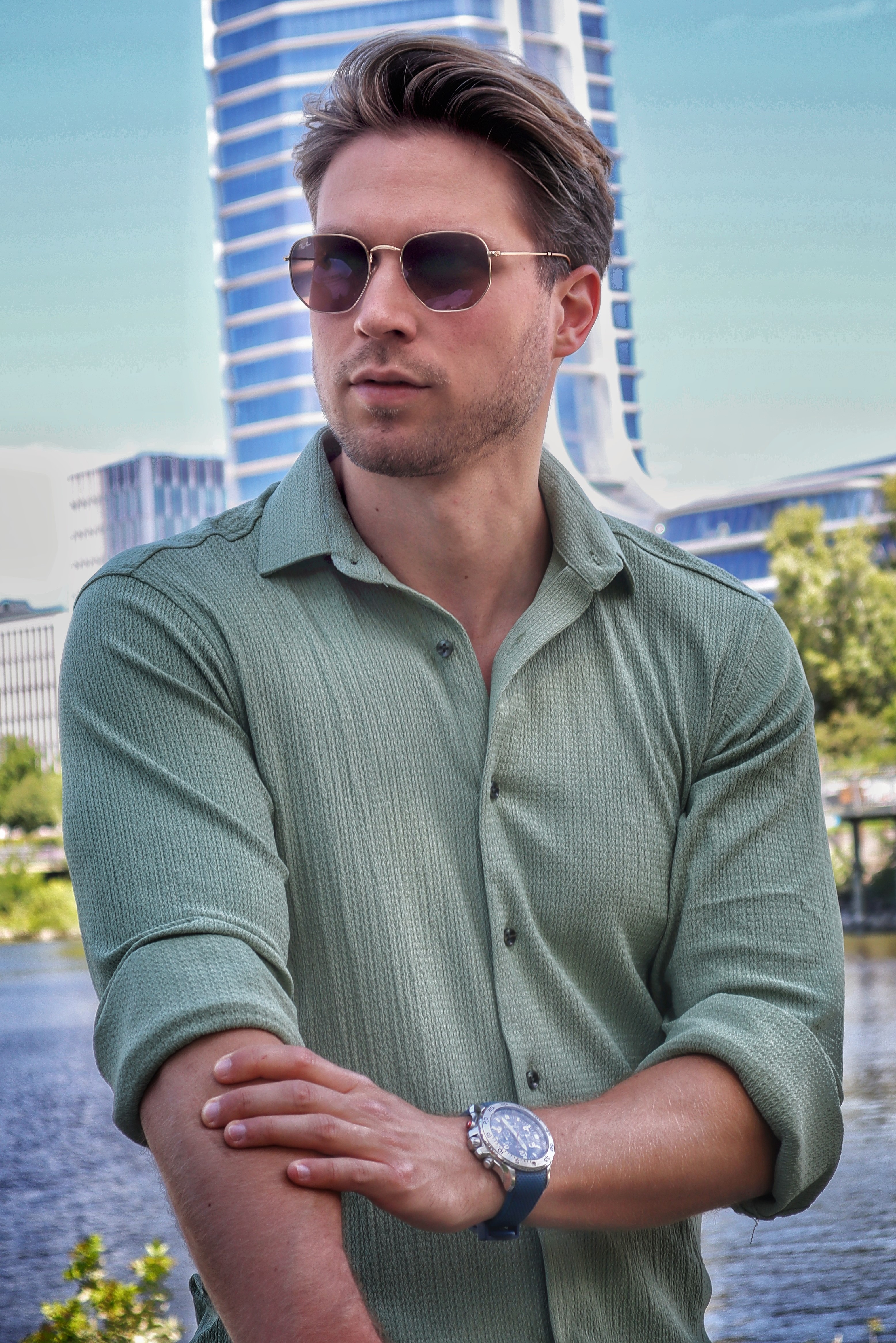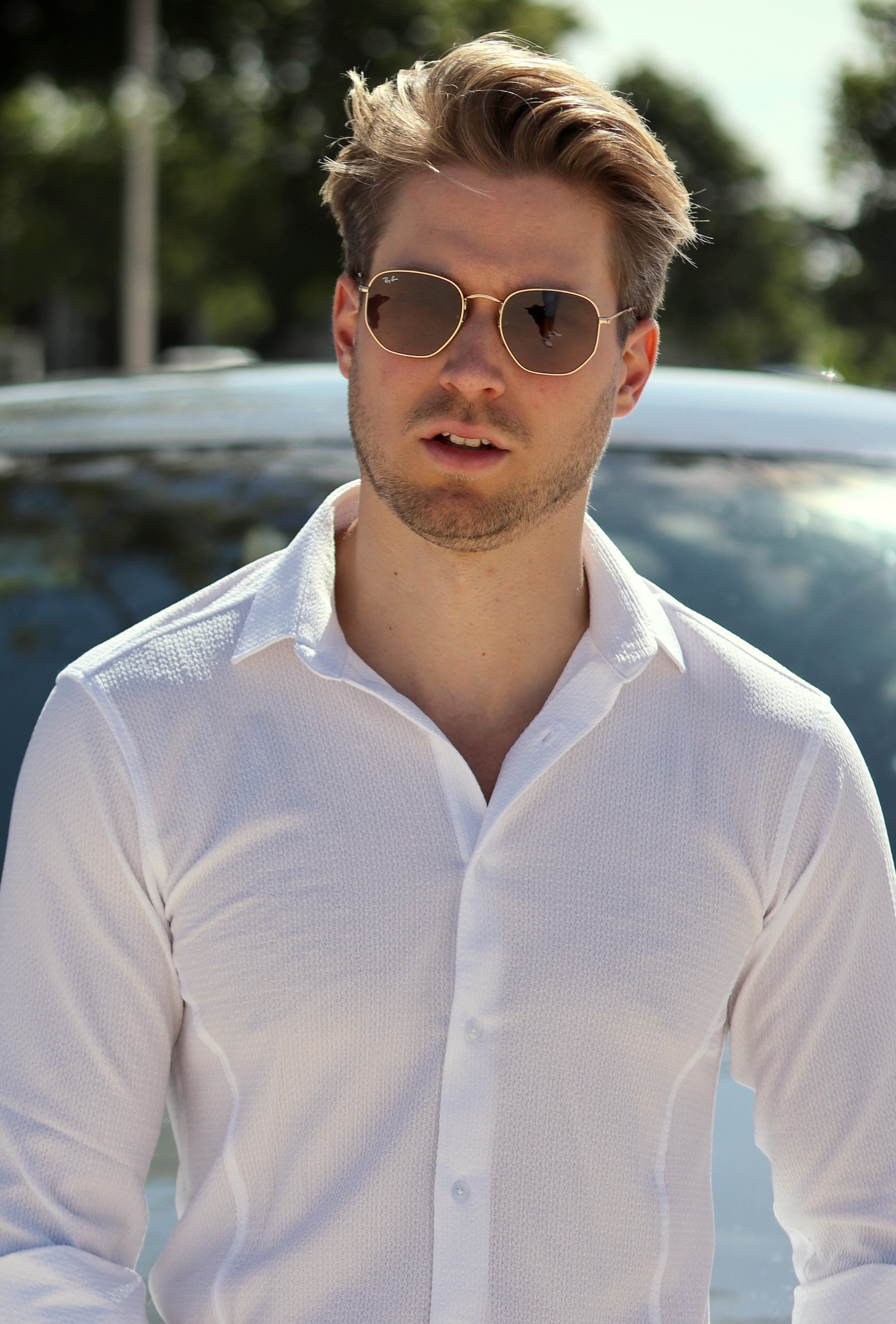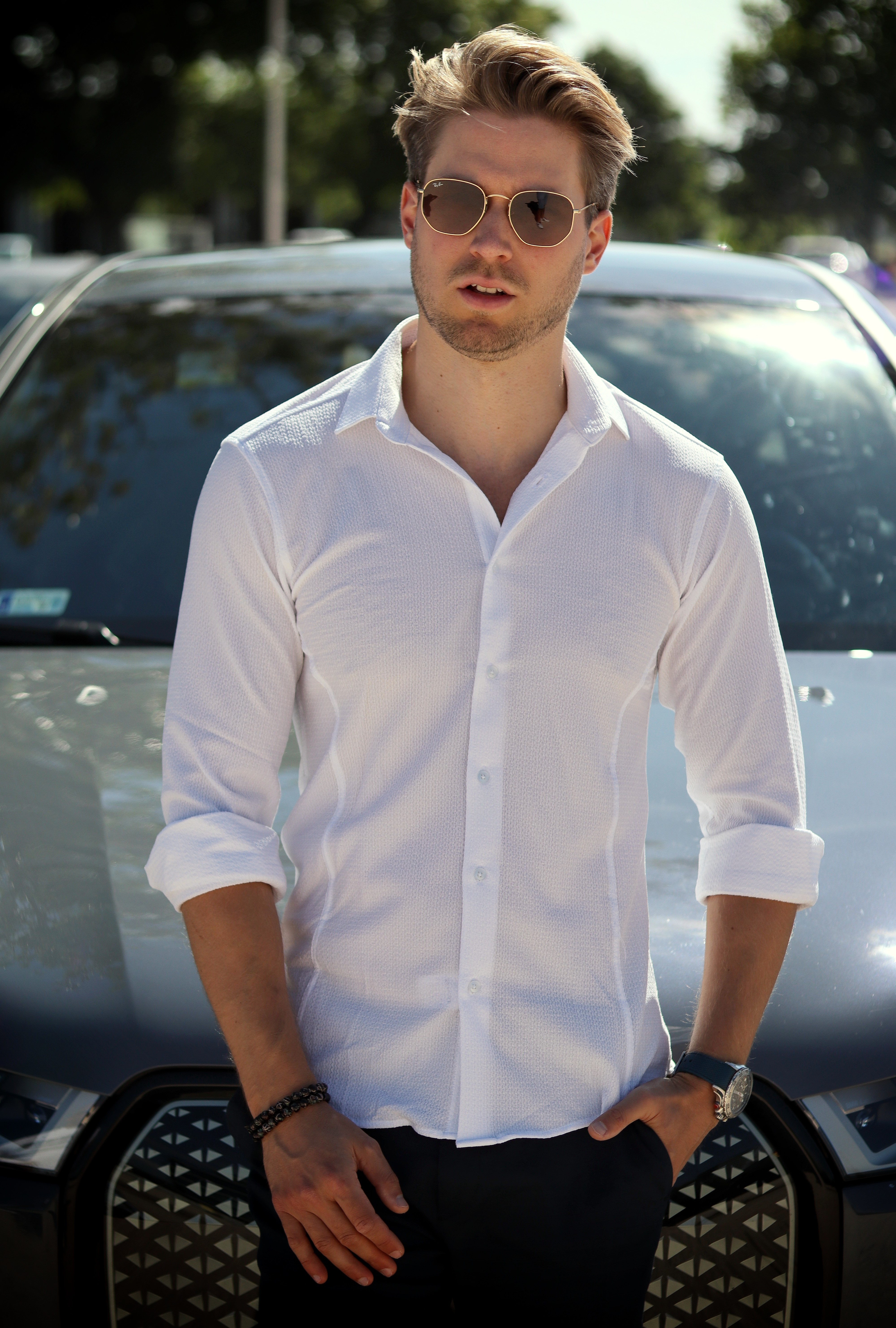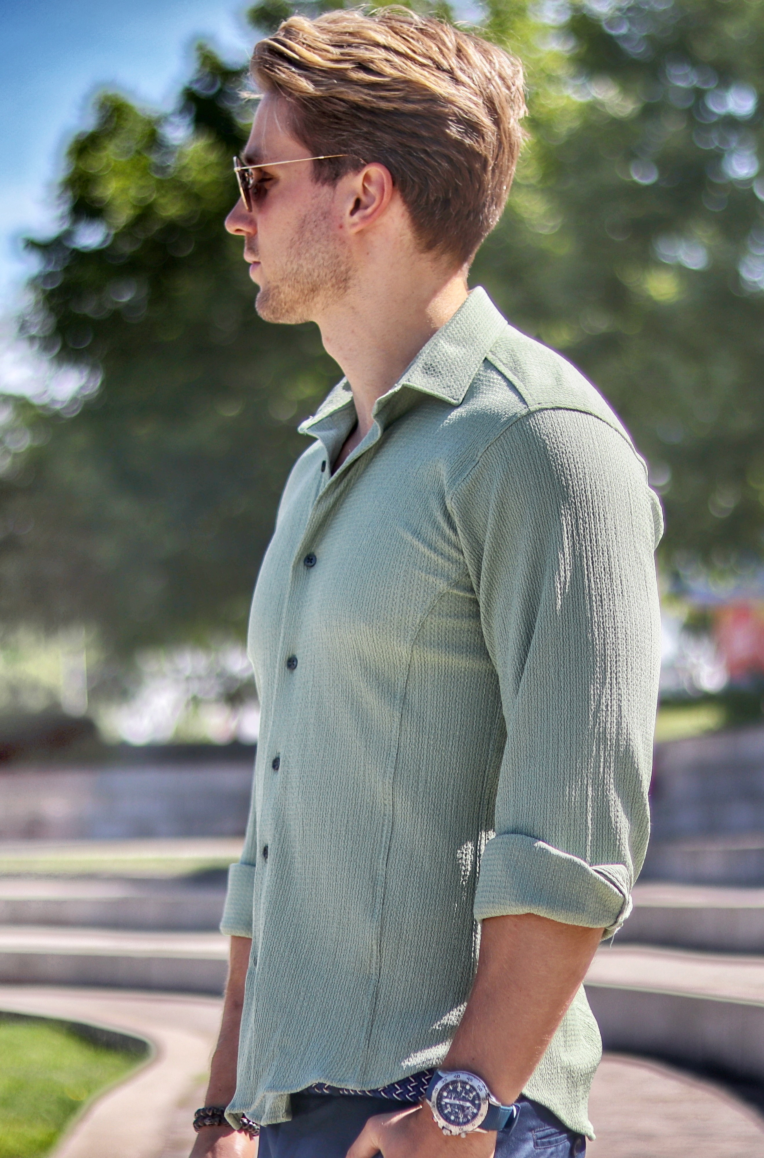 Extra rugalmas pamutból készült, kreppelt (apró gyűrődések) ing. Rendkívül kényelmes viselet. Ha betűrve hordjuk elegánsabb, ha kitűrve akkor lazább hatást kelt. Szolid B hímzett logó található a mandzsettán.  Slim fit. 95% pamut 5% lycra