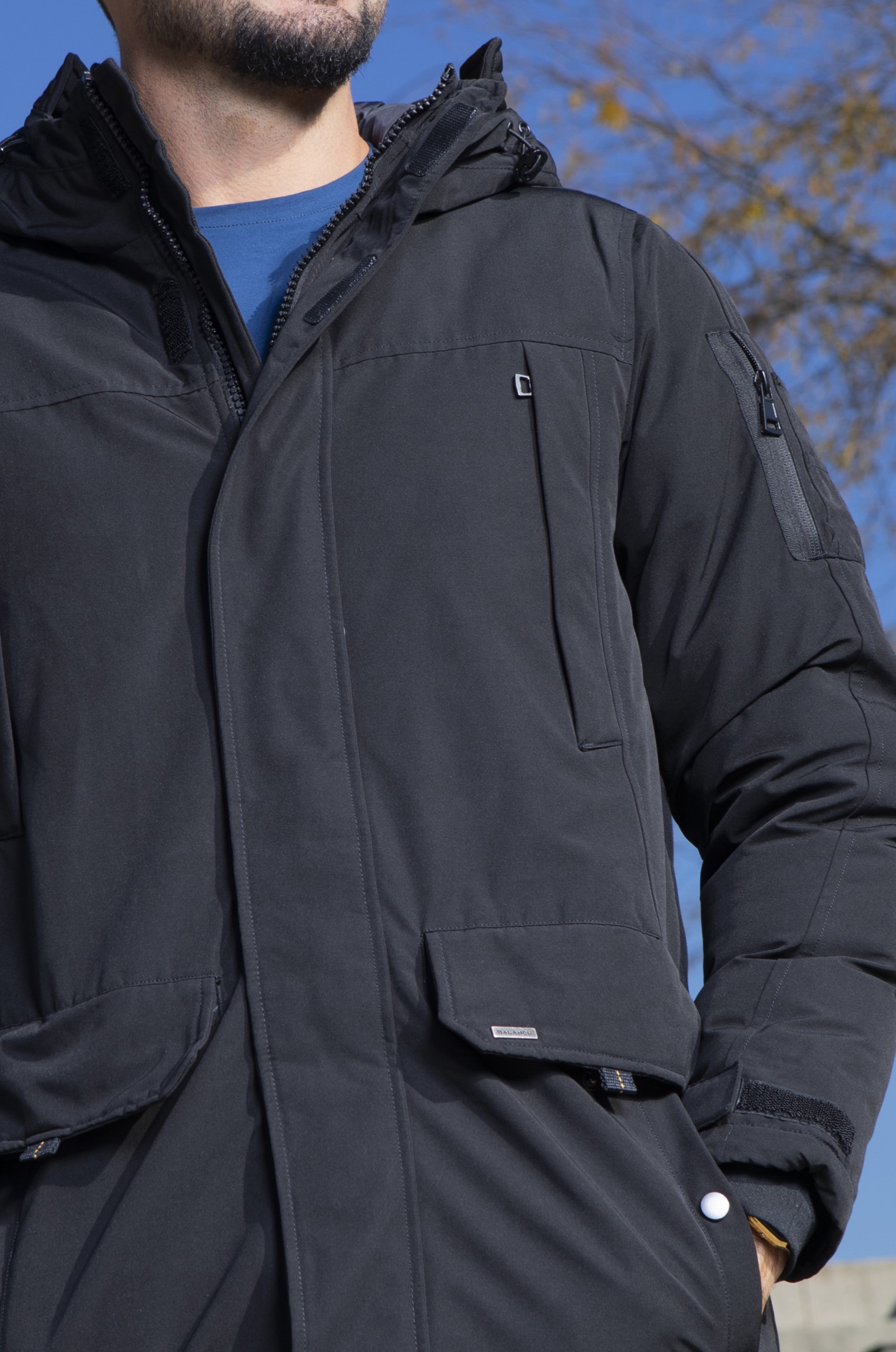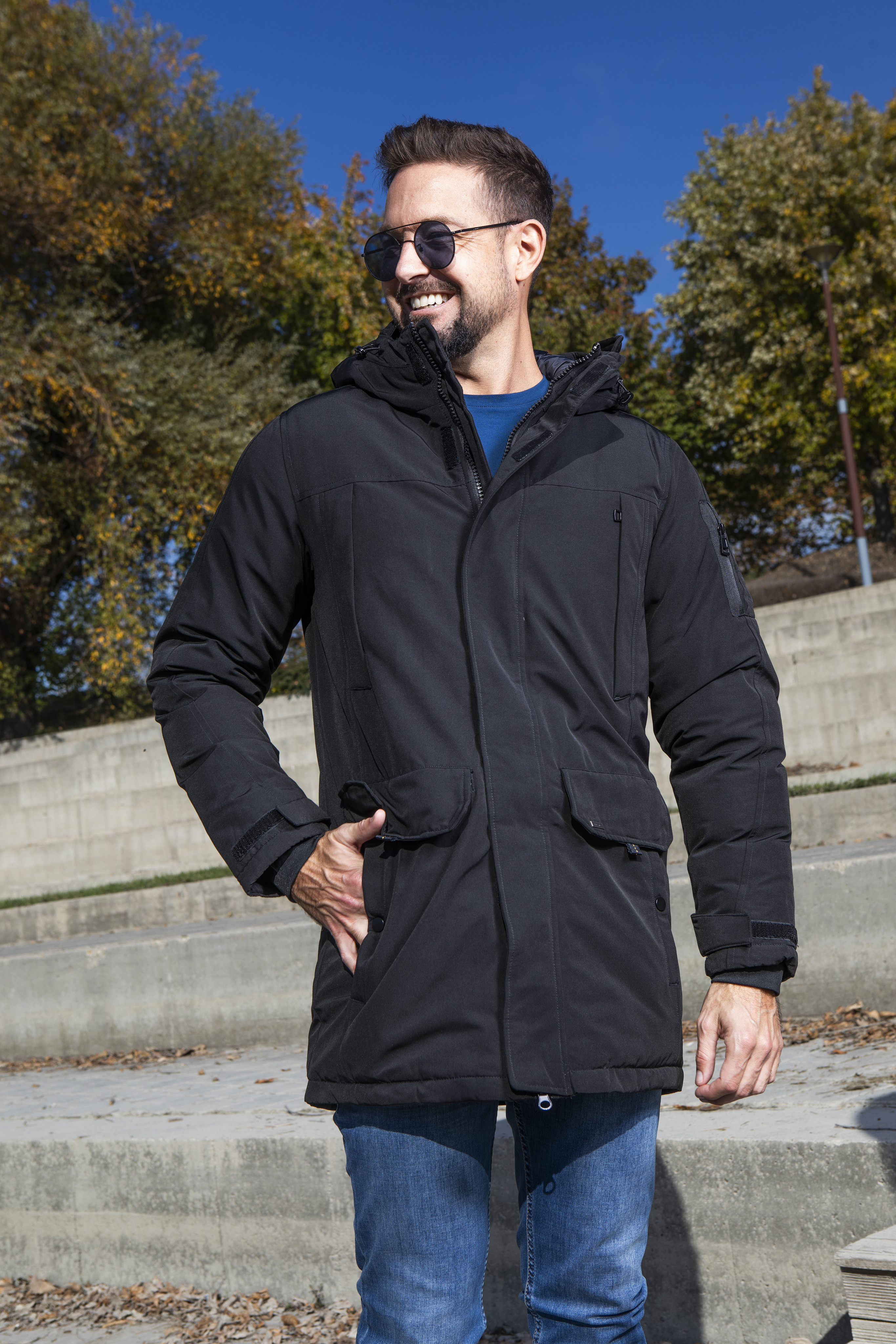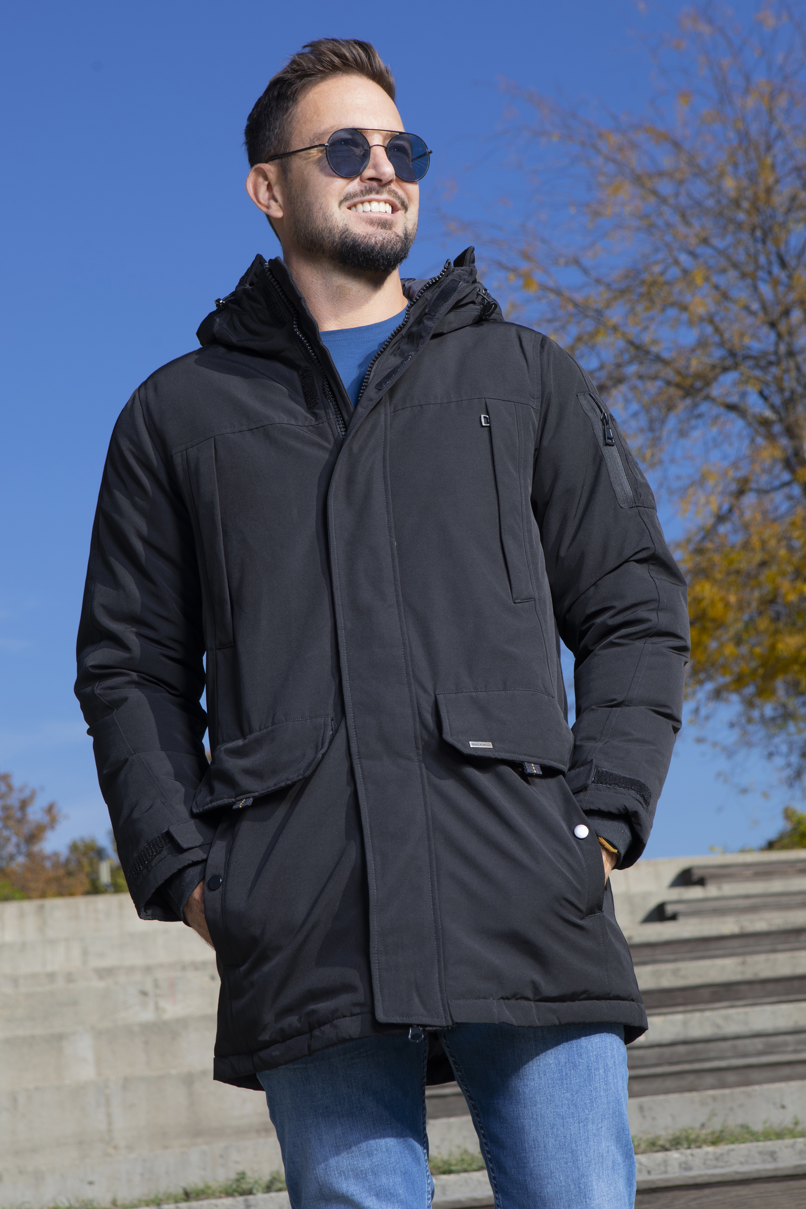 Vastag télikabát, vízlepergető anyagból. Sok zsebbel. A zseb alatt és a vállán szolid dísz szalag található.