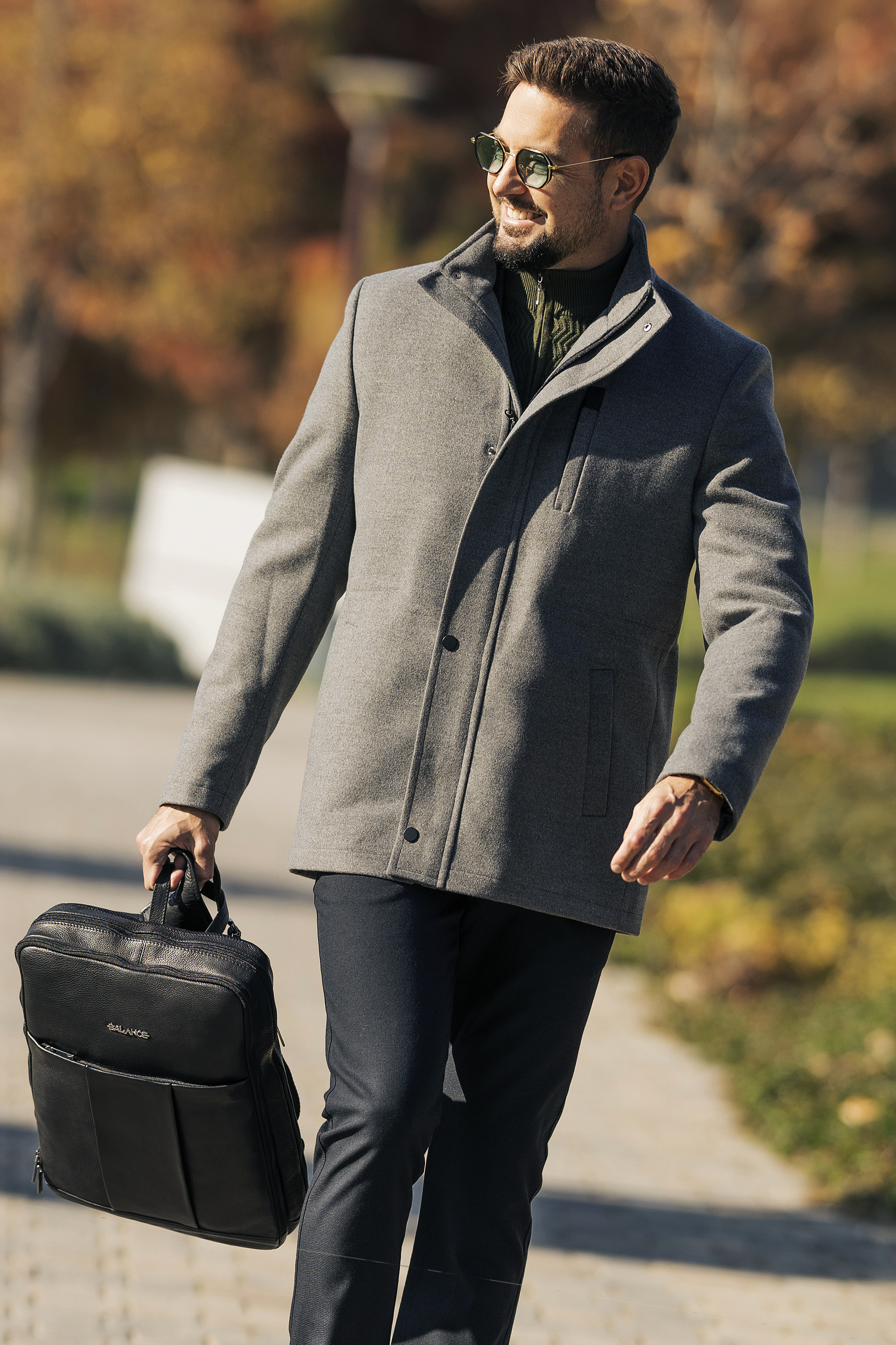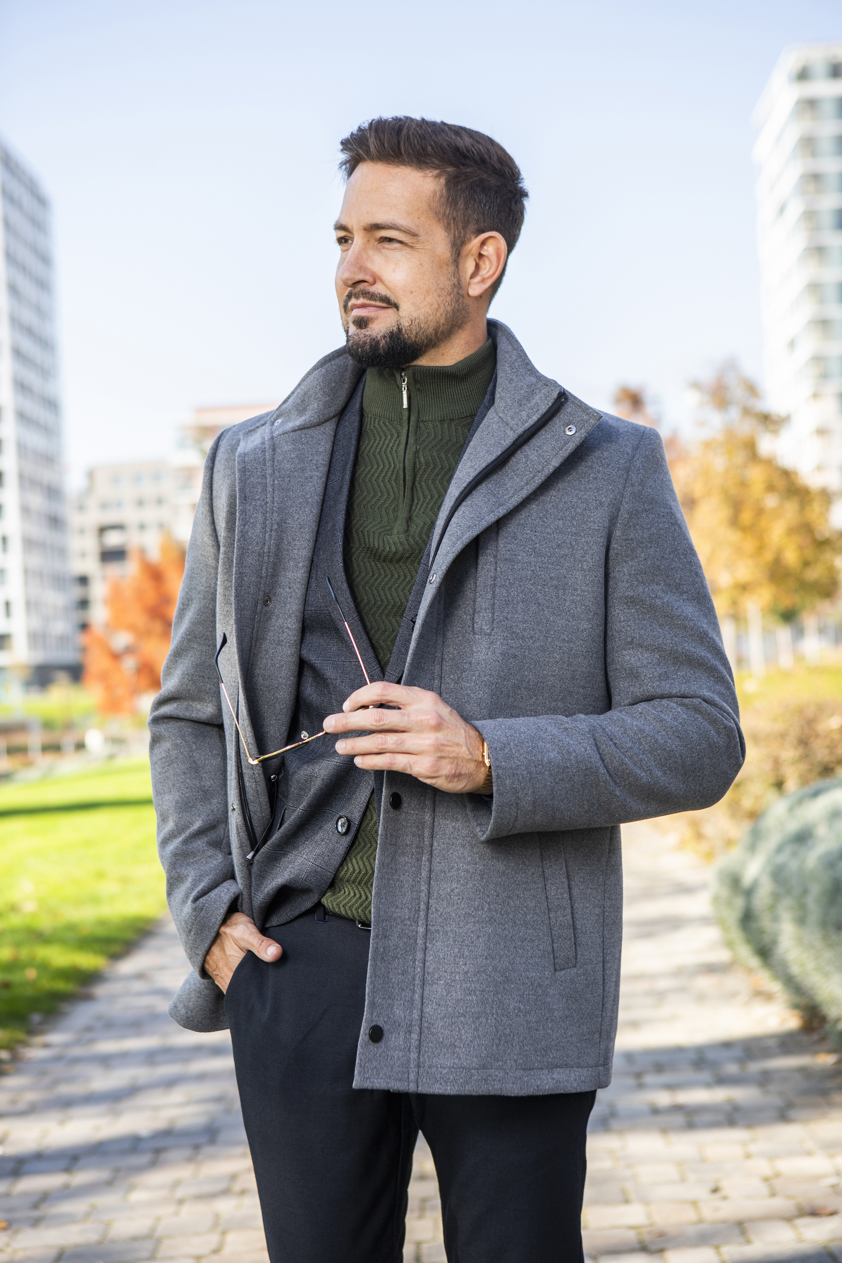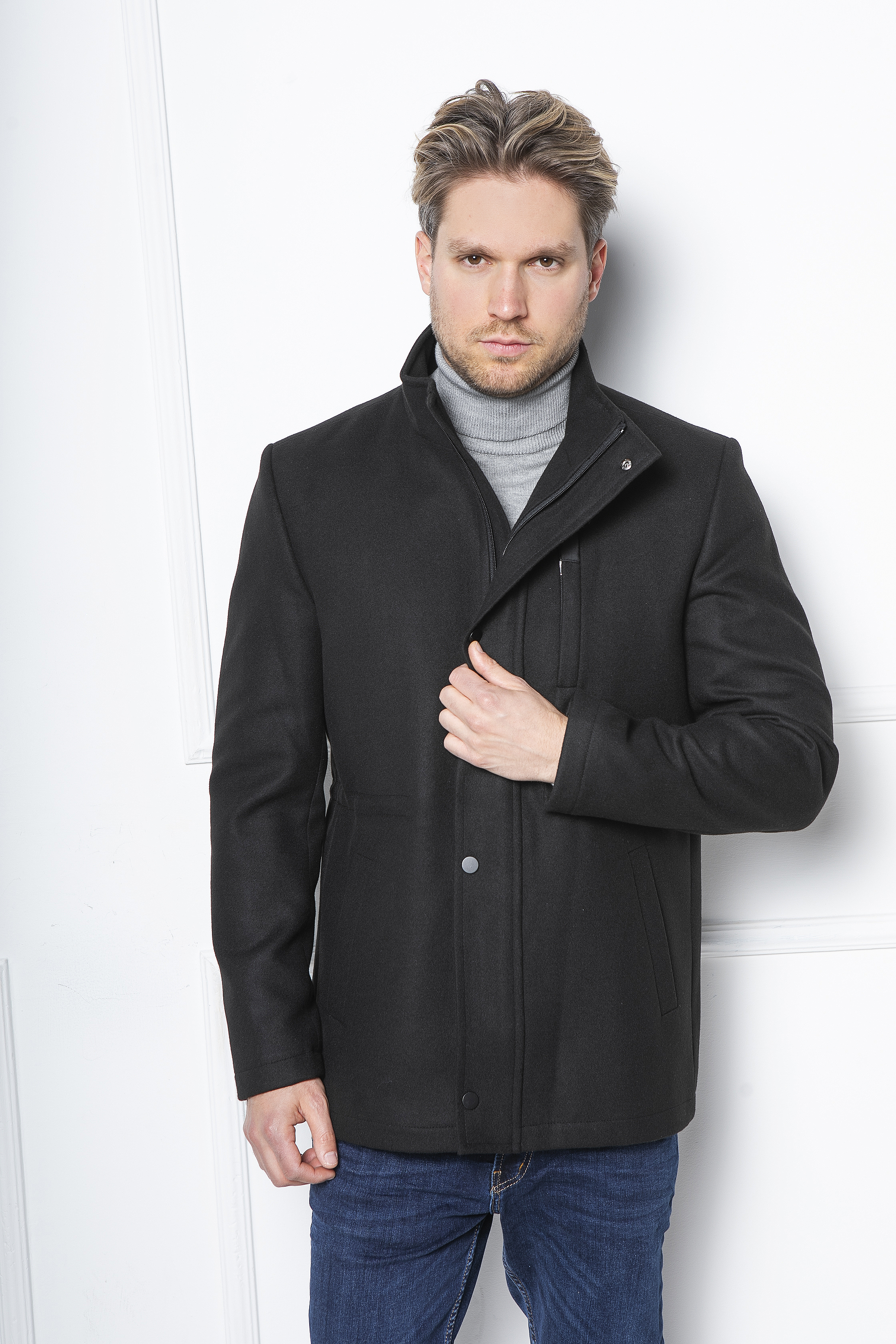 Állógalléros szövetkabát, modern fazonban. Prémium bolyhosodás mentes anyagból készült. Igényes belső kidolgozás. Slim fit.