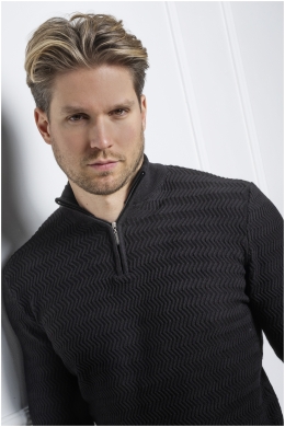 Kötött pulóver fél cipzáros nyakkal, álló gallérral. A pulóver strukturált kötéssel készült. Műanyag a cipzás, a húzóka viszont fém. Szolid fémlogó található a pulóver elején, az alsó passzé fölött. Regular fit (egy mérettel érdemes kisebbet rendelni a megszokottnál) 50% pamut, 50% akril