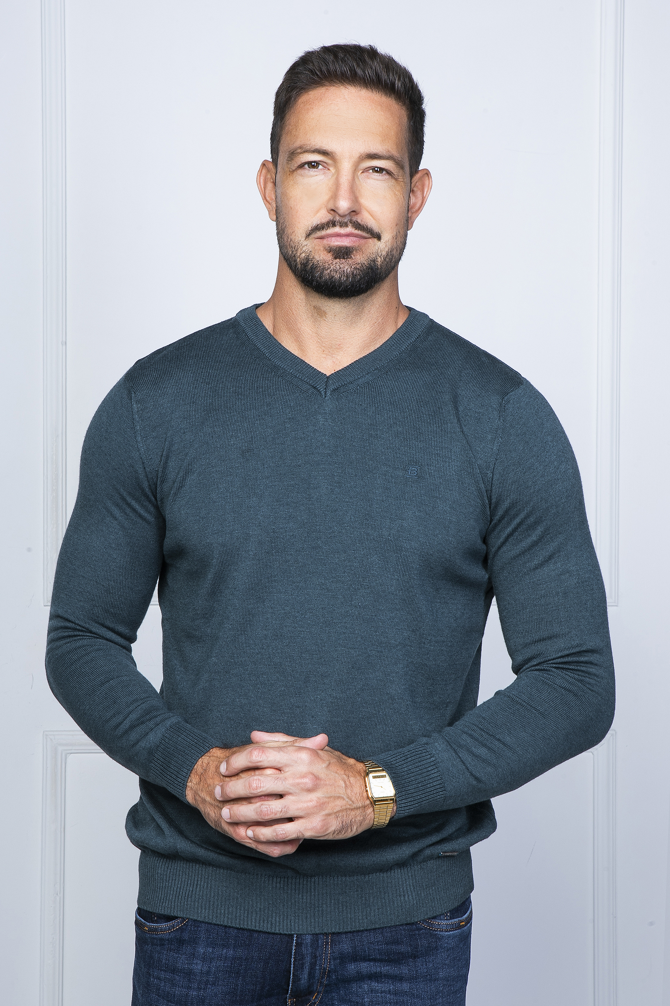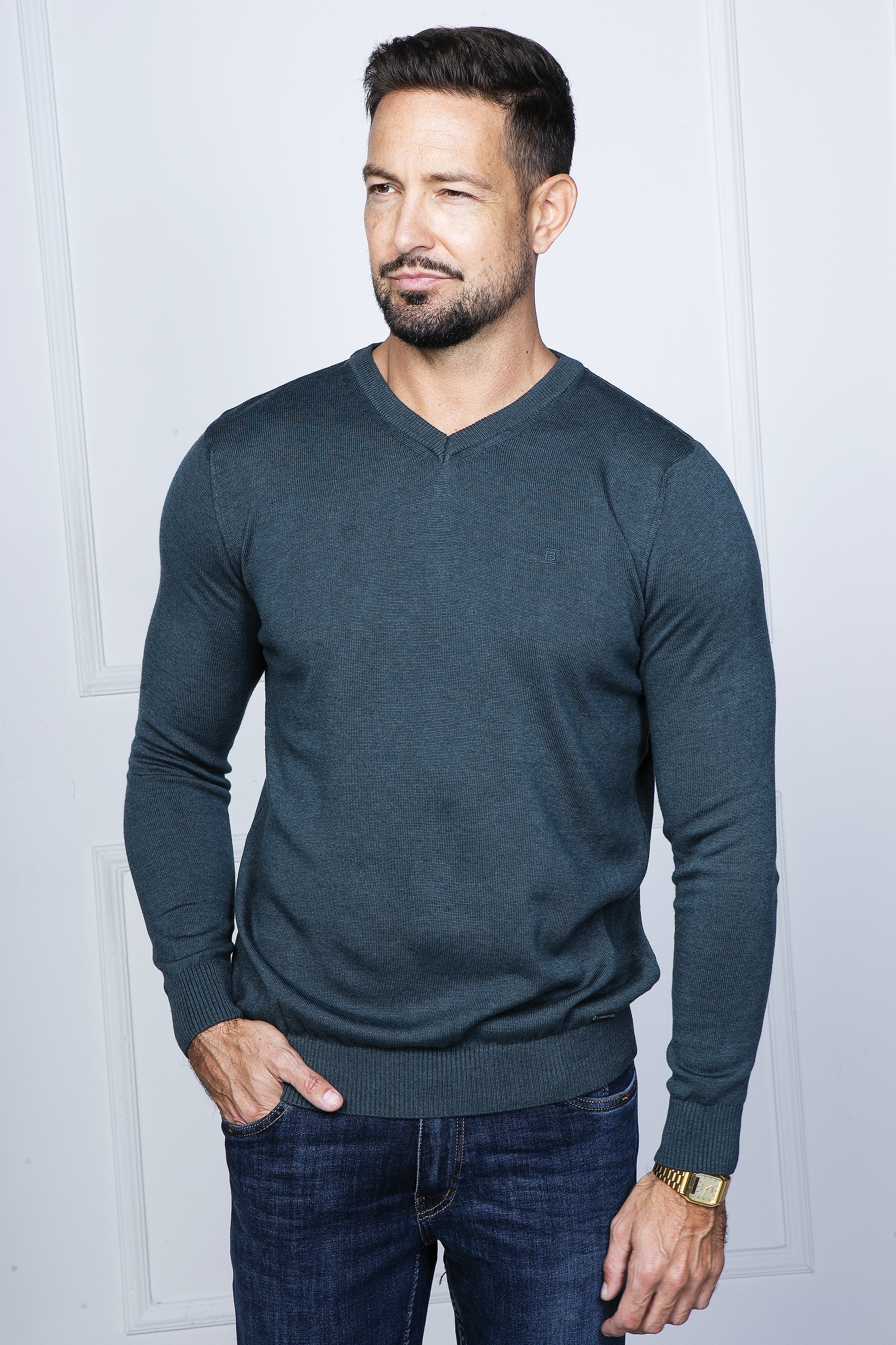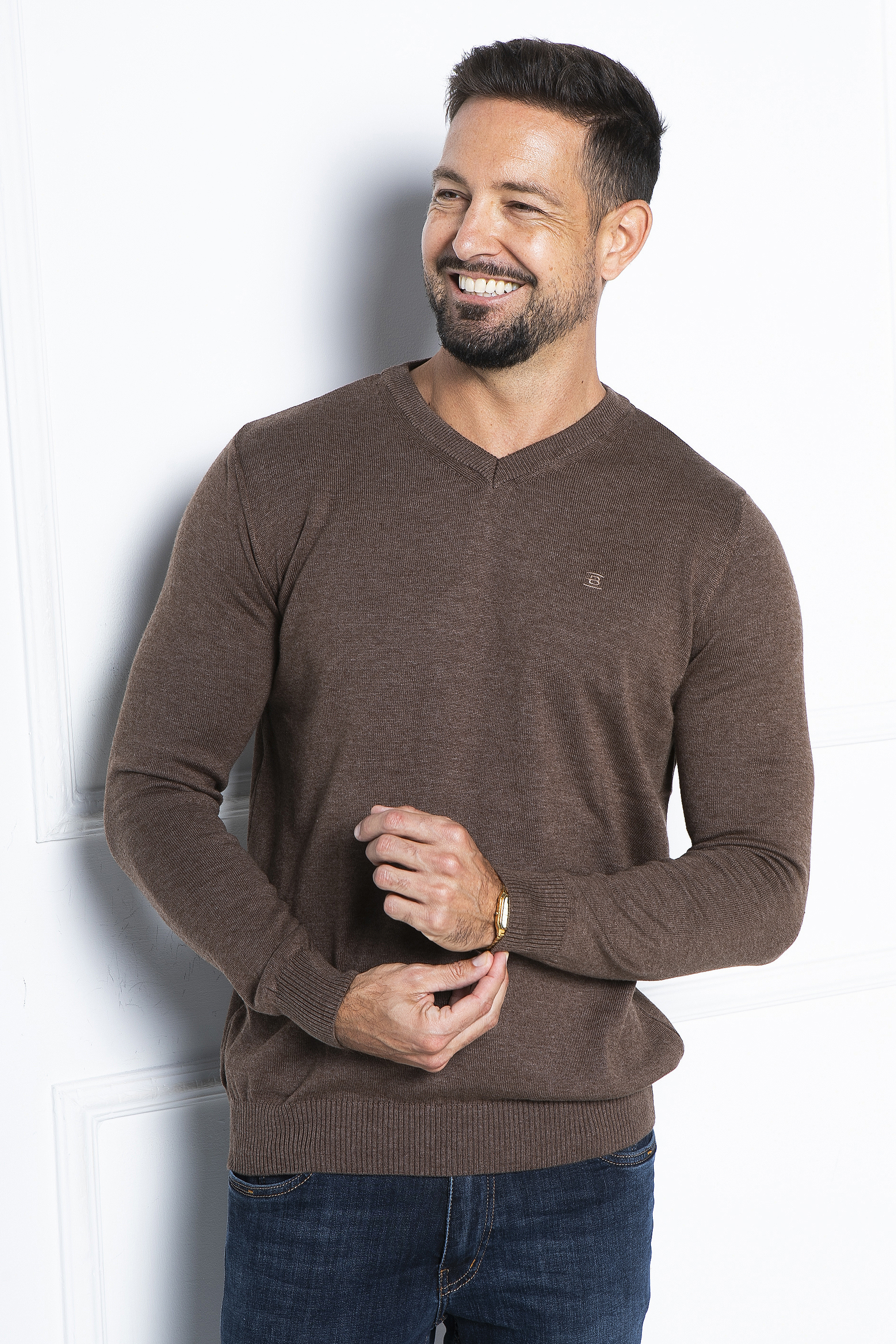 Melange kötött pulóver V nyakkal. Szolid hímzéssel a mellén és fém logó díszítéssel a passzé fölött. Remek viselet inggel kombinálva vagy akár önmagában hordva.