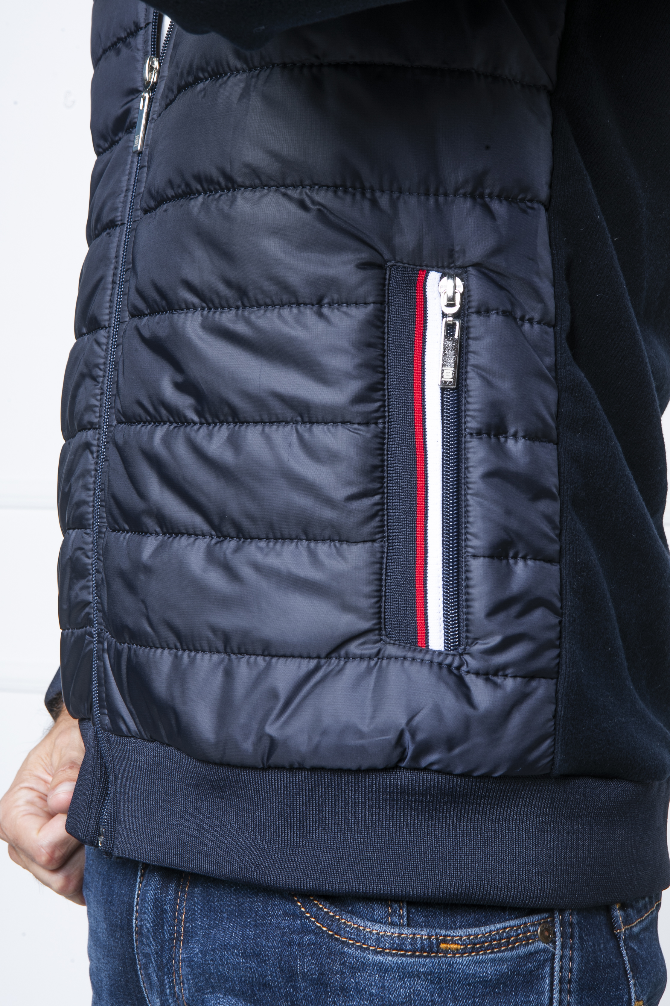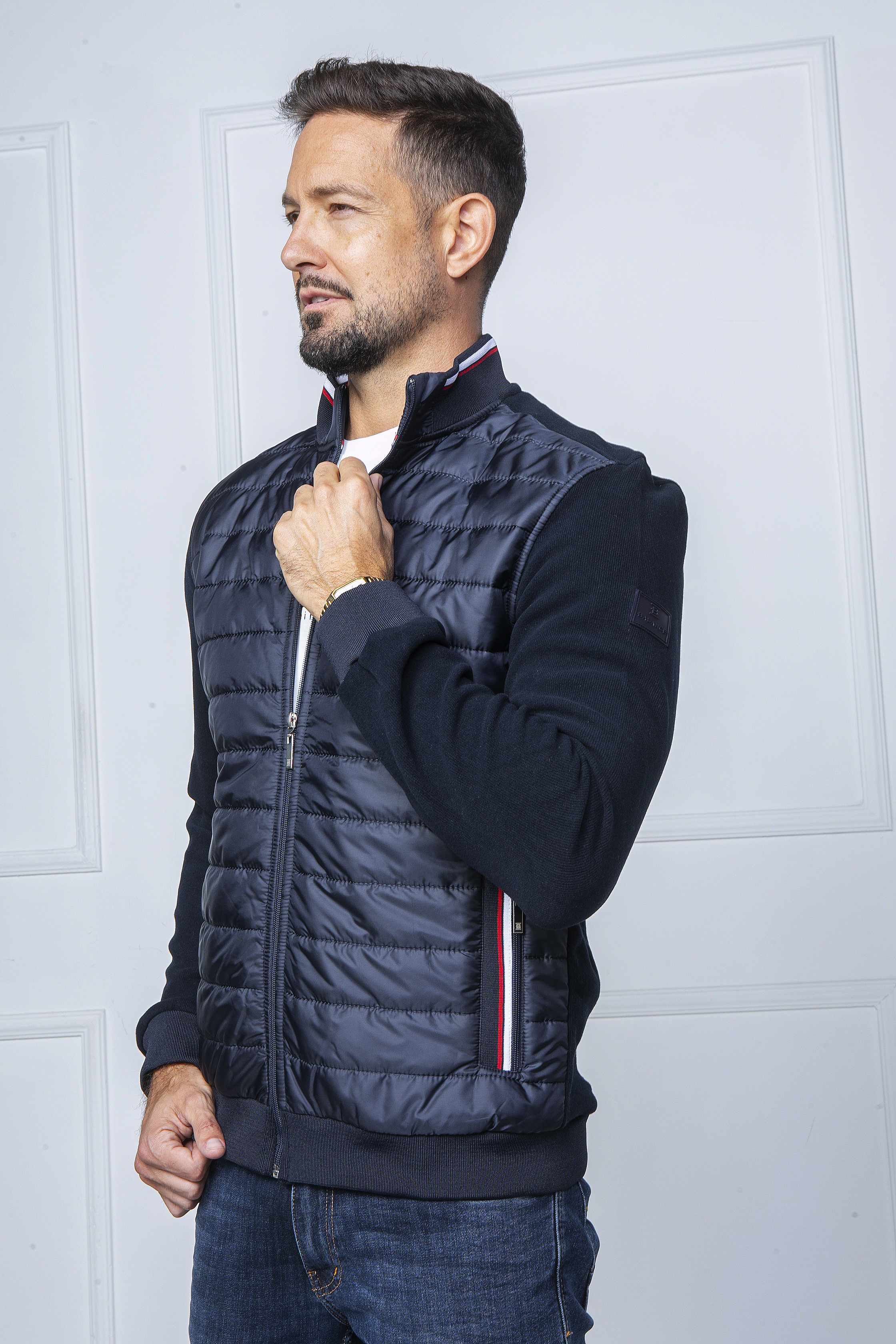 Steppelt elejű kardigán. Háta és az ujja sima pamutból készült. Színes szalag díszítéssel és gumi címkével az ujján. Slim fit