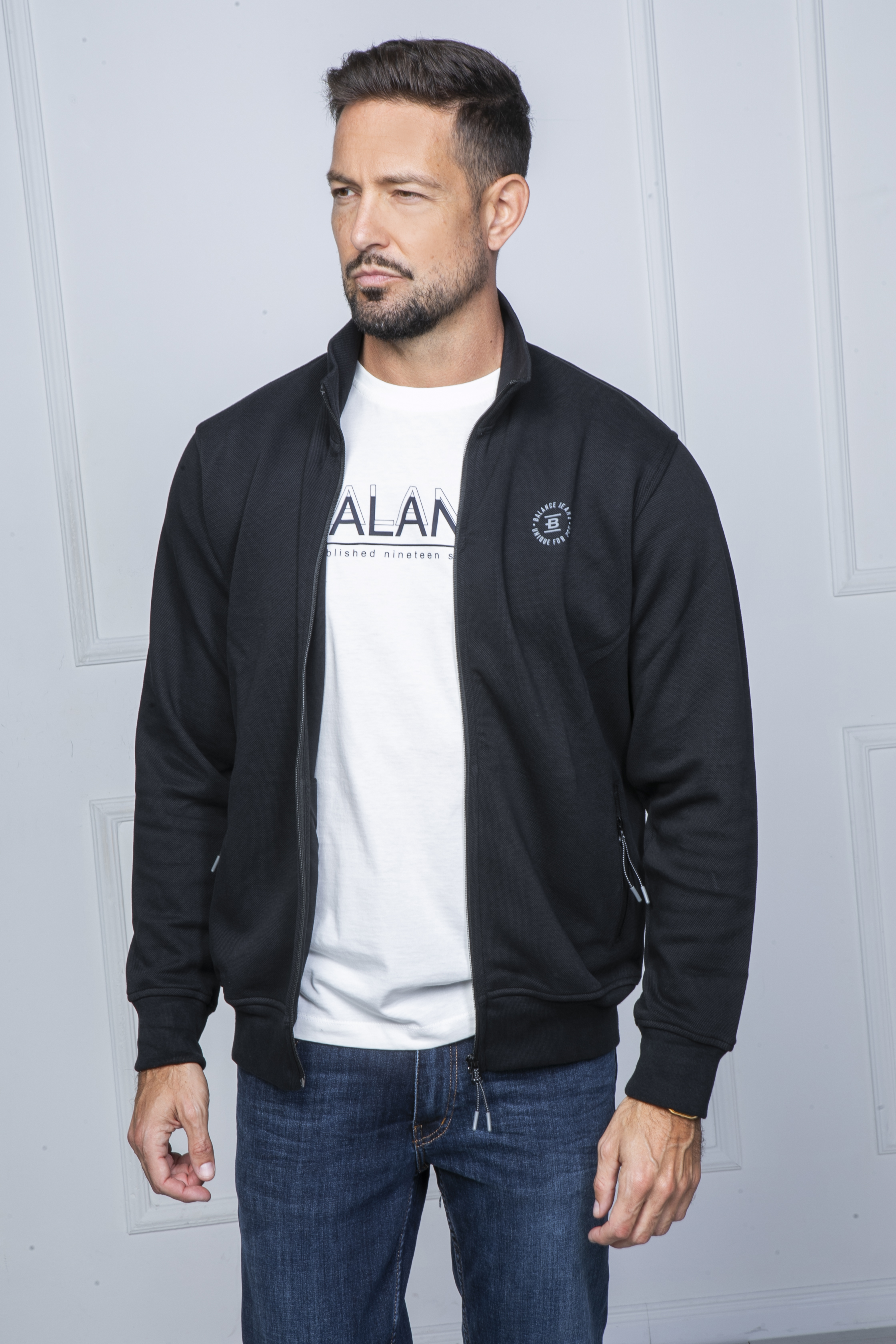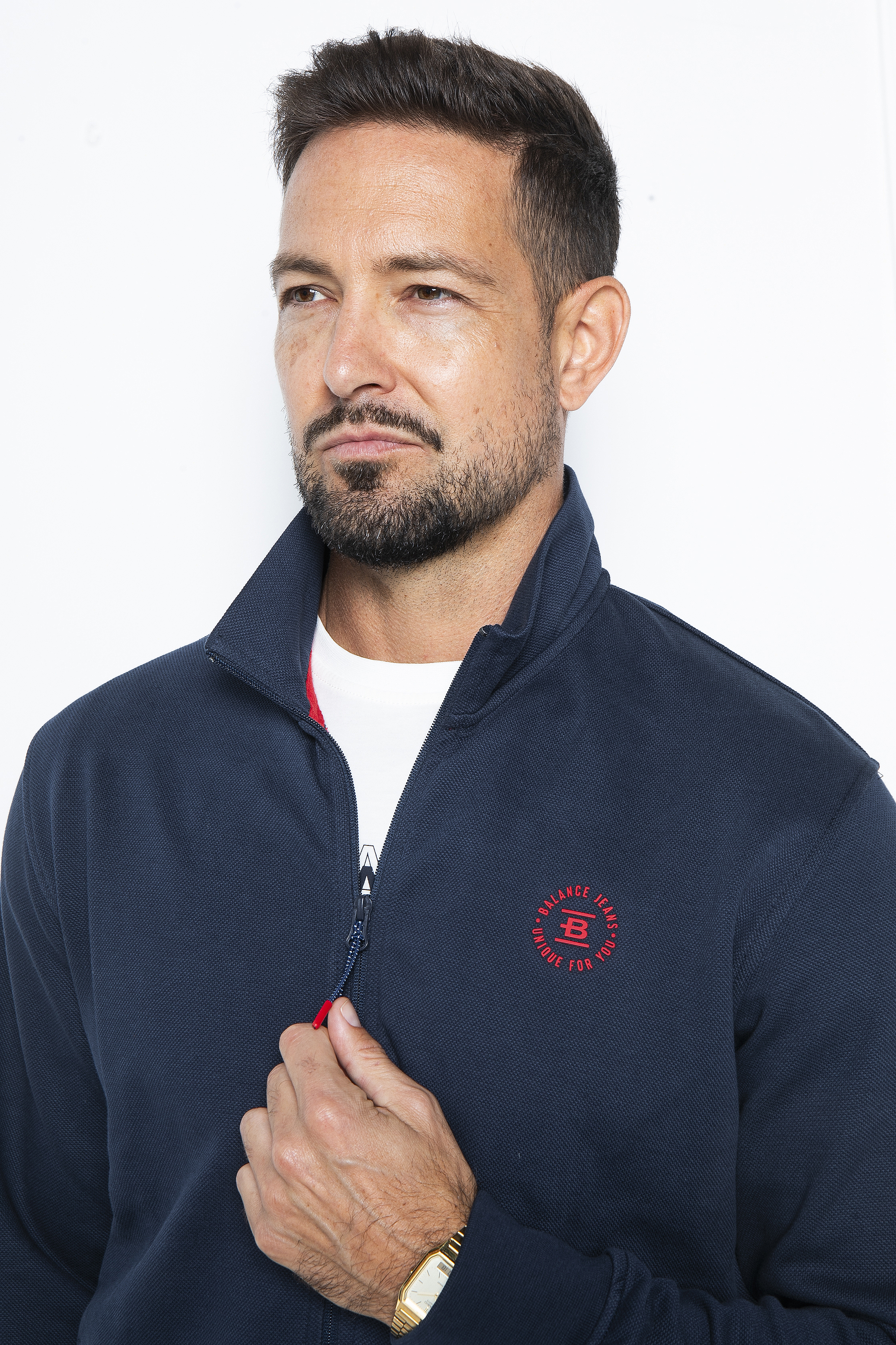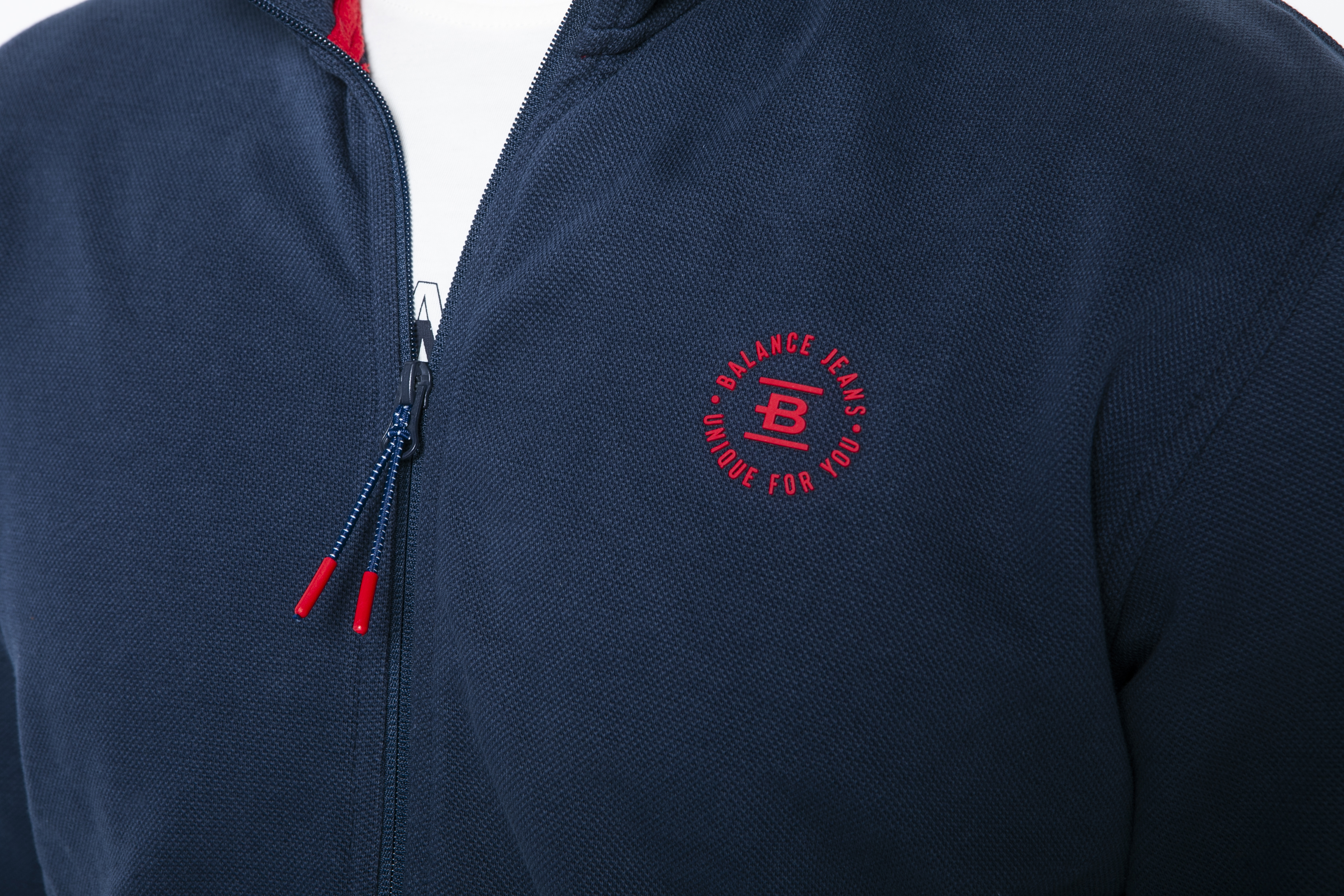 Zipzáras pulóver, vastag piké anyagból. Színes kiegészítőkkel ( a kék pulóveren piros, a feketén szürke) és mell nyomattal.
