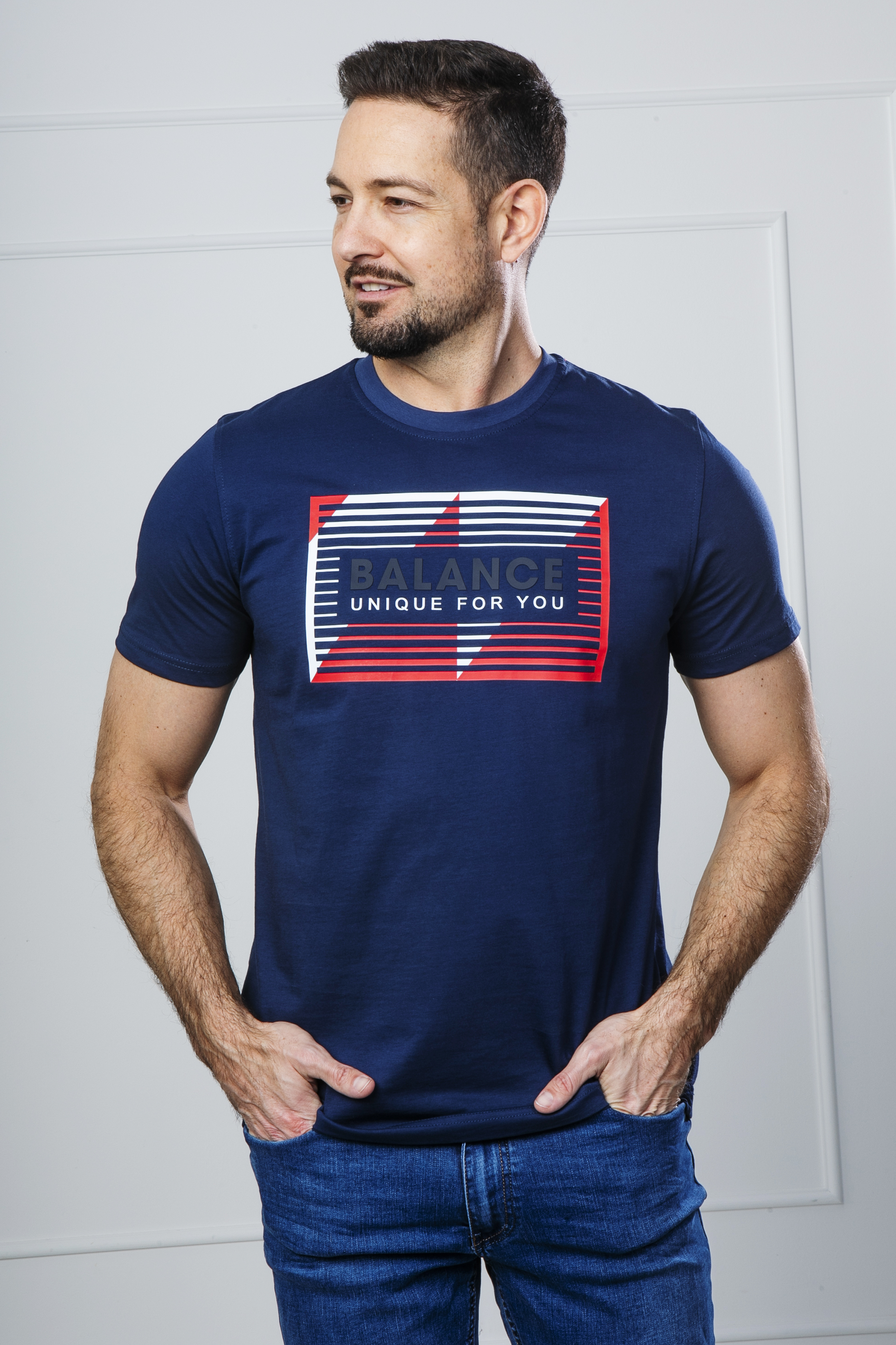 A modell 182 cm, 80kg, sportos testalkatú és L méretű póló van rajta a képeken.