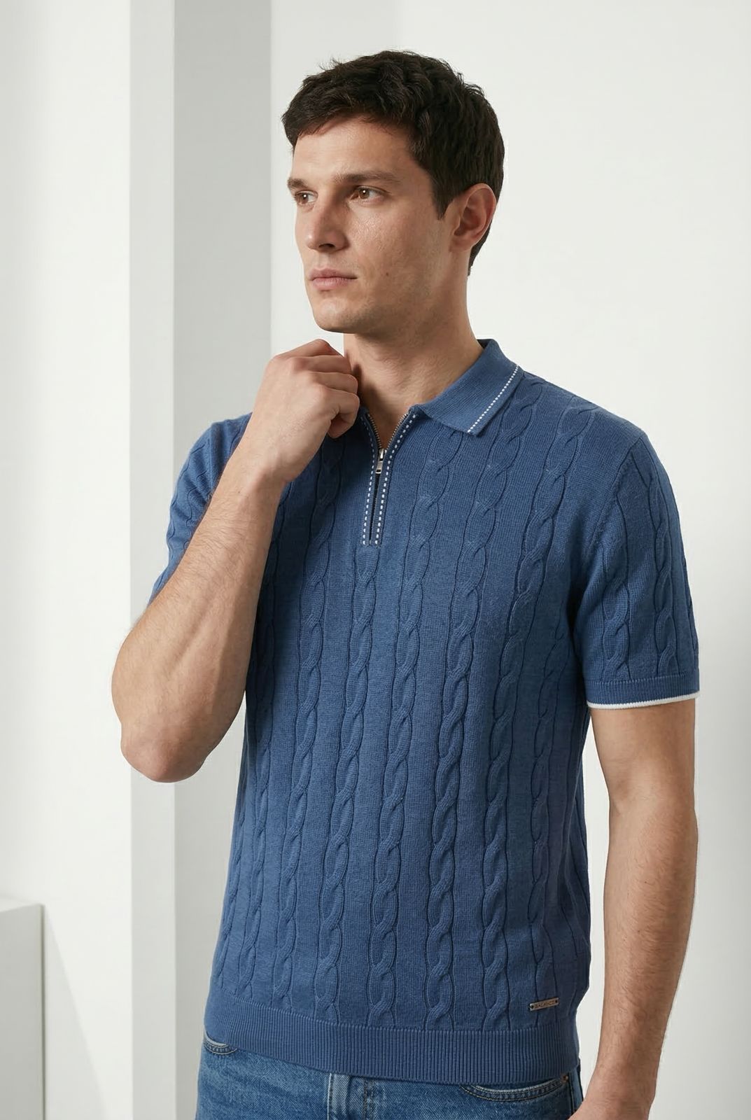 Csavart mintás vékony kötött póló gallérral és zipzárral. A galléron és a zipzár mellett halvány csíkminta van. Szolid fémlogó  található elöl az alsó  passzé felett. Könnyű szellős anyaga miatt remekül hordható az átmeneti időszakokban, de akár a nyári estéken is. Elegáns viselet, akár zakóval is kombinálható. 50% viszkóz 50% acryl